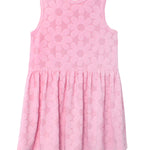 This pink daisy terry cloth sun dress, featuring a v-waist and sleeveless design, is ideal for everyday adventures. It also doubles as a stylish cover-up for family beach outings.