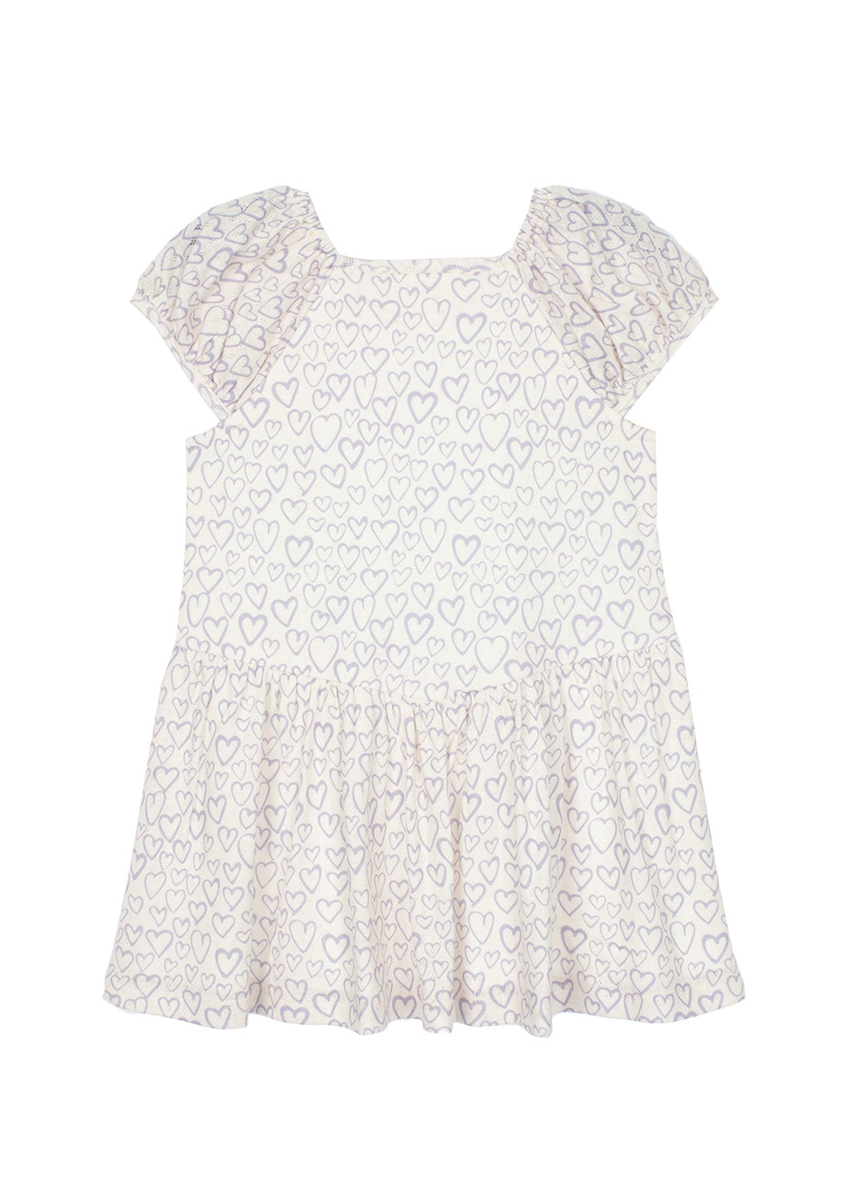 This girls' dress features a soft ivory base adorned with a delicate lavender heart print. Designed with puffed cap sleeves and a scoop neckline, it offers a sweet and timeless look. The tiered skirt adds a playful touch, while the lightweight fabric ensures comfort, making it perfect for everyday wear or special occasions.