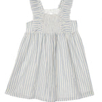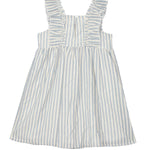 This light blue and white striped dress is crafted from soft, woven fabric with a breathable feel. The smocked bodice offers a comfortable fit, while the ruffled shoulder straps add a delicate touch. A gathered skirt creates a flowy silhouette, making this dress both stylish and easy to wear.