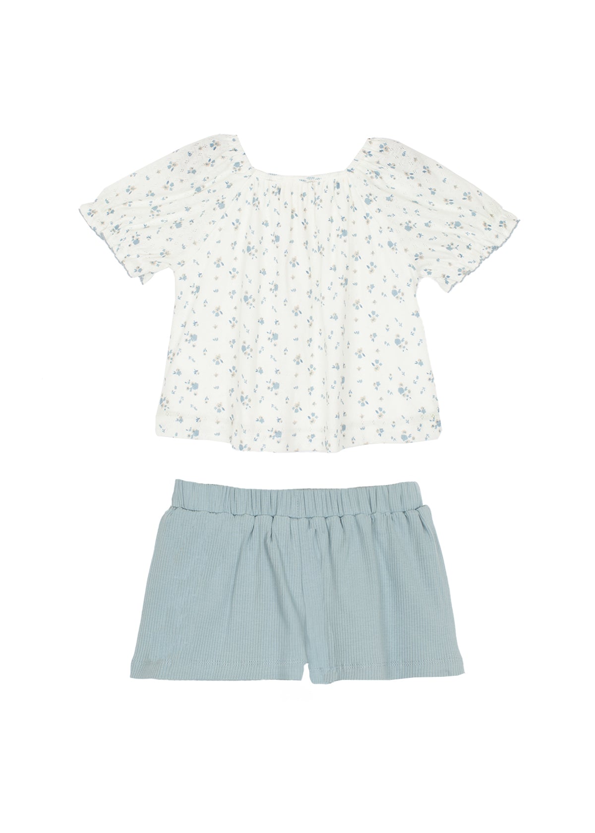 This adorable 2PC set for girls features a sweet and delicate soft blue flower pattern. The top has a puff sleeve square neck line, paired with light blue knit shorts.