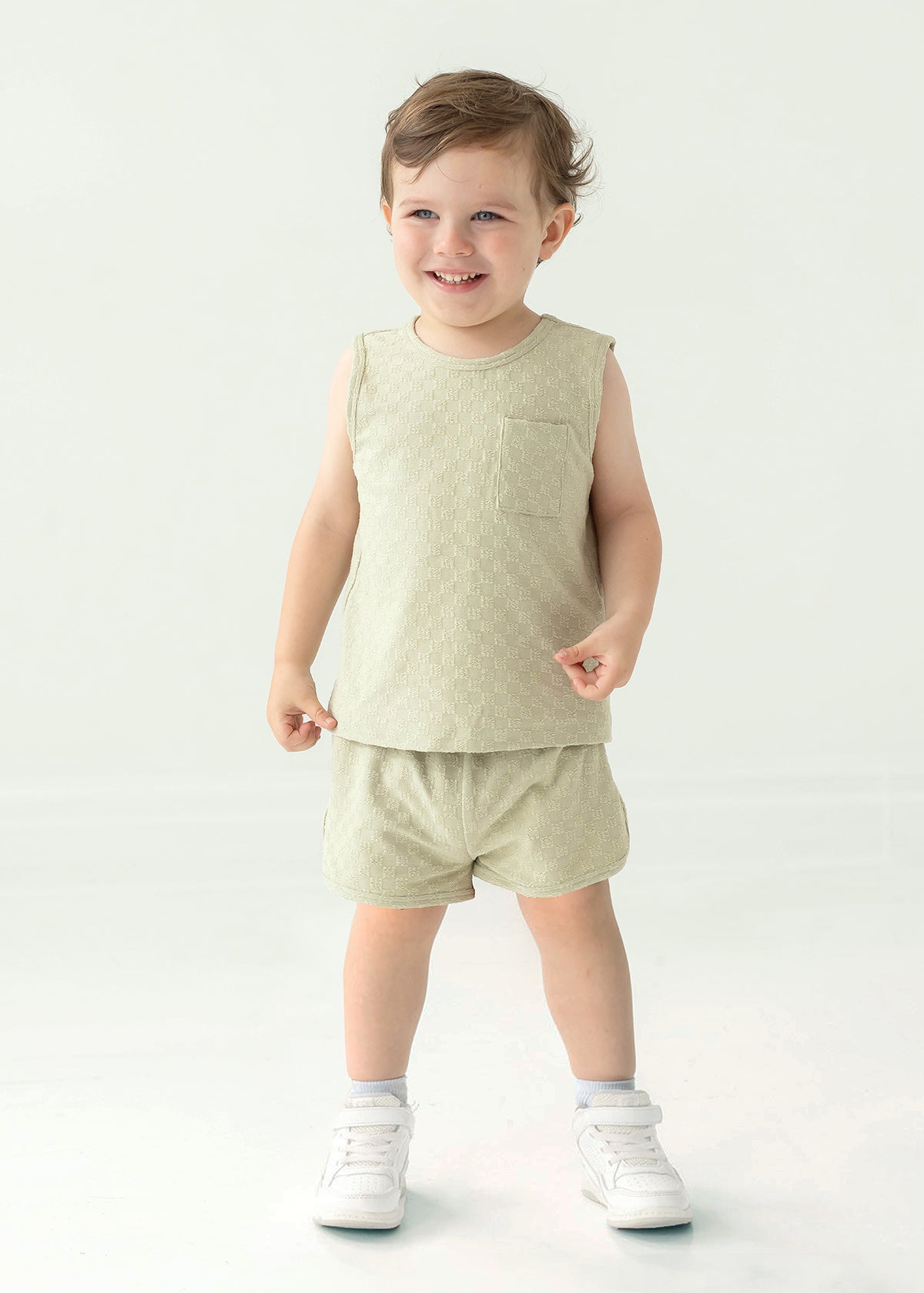 This boys' two-piece set in a muted sage tone features a sleeveless top with a subtle textured pattern and a small chest pocket for added detail. The coordinating shorts offer a relaxed fit with an elastic waistband and side pockets, making this breathable and lightweight outfit perfect for everyday wear.