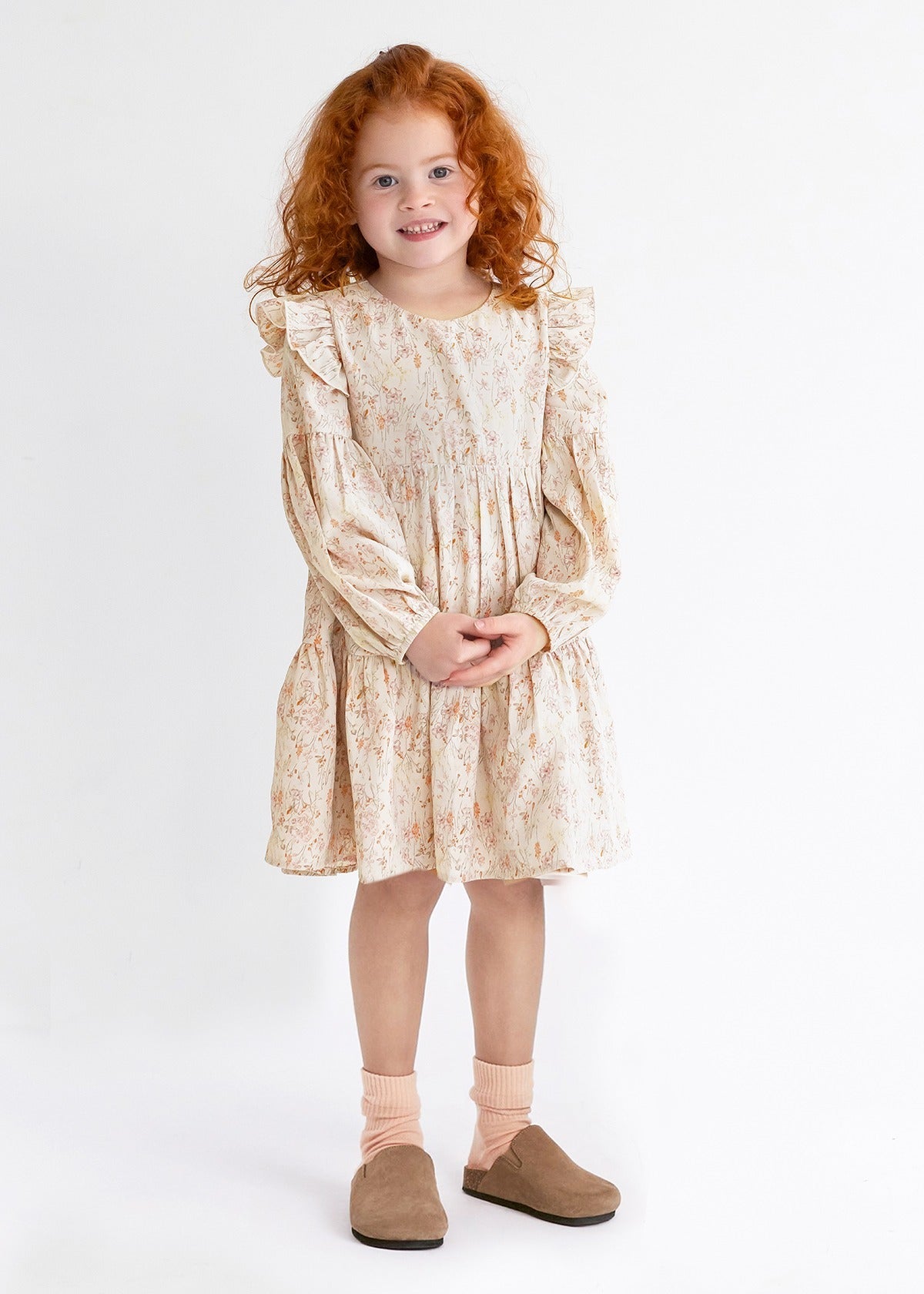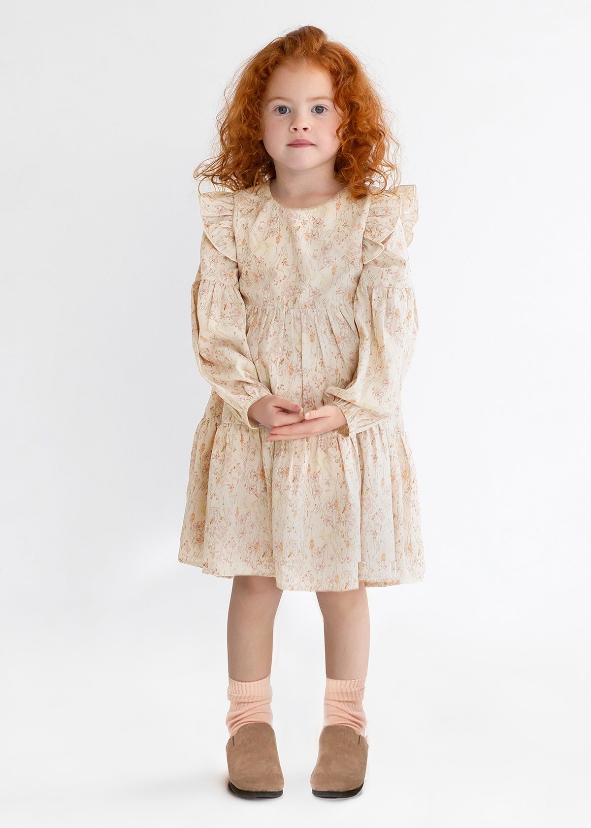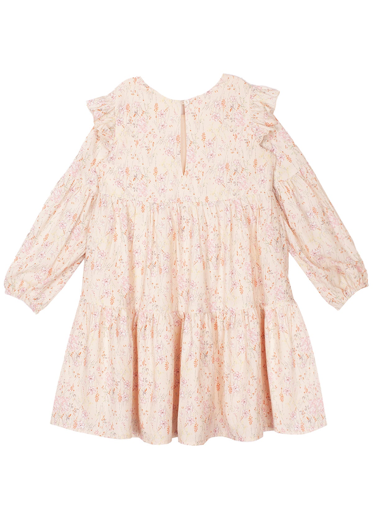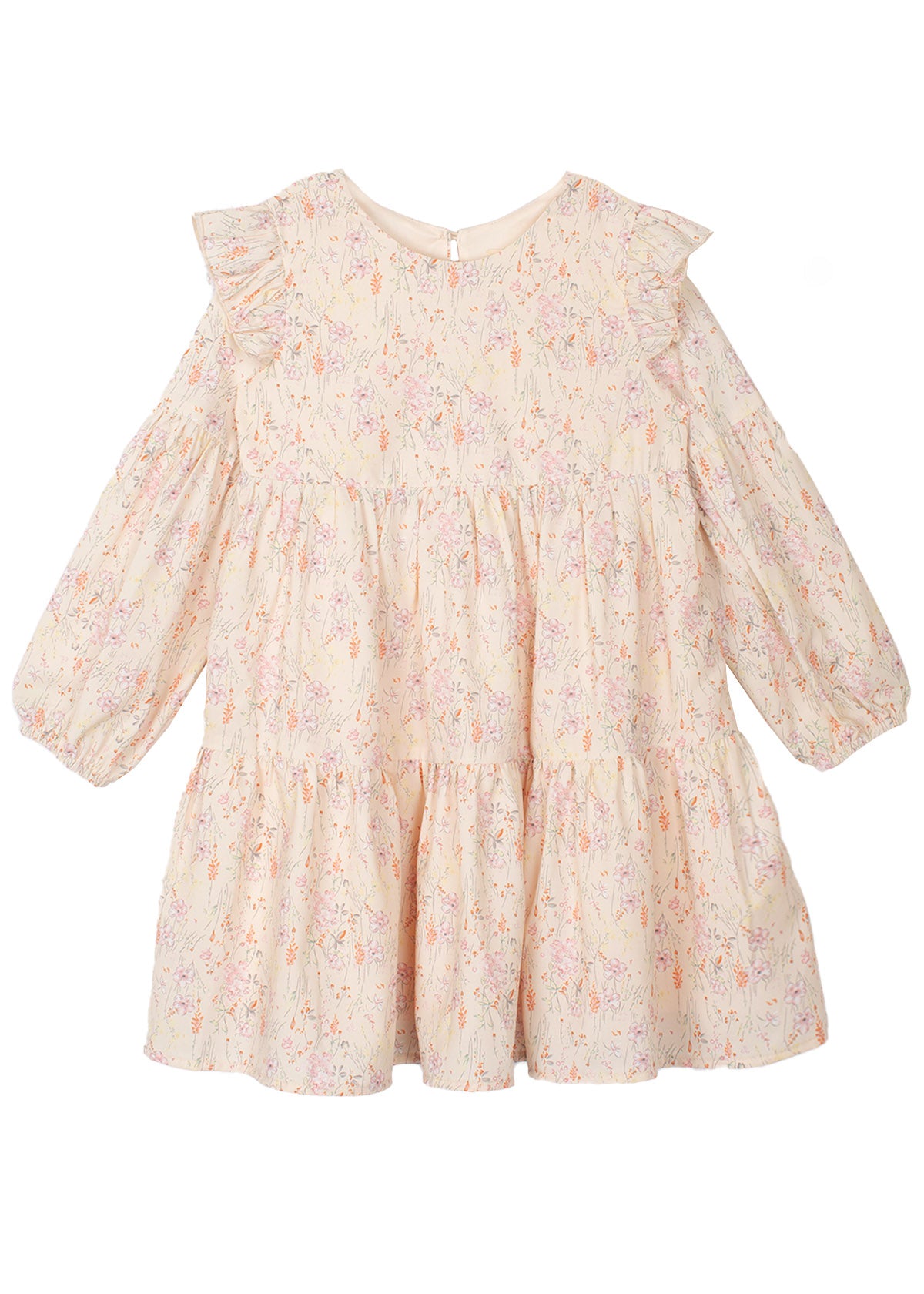 This charming girls' dress features a delightful floral print in soft pastel hues, perfect for any occasion. The dress boasts long puff sleeves and a tiered design, adding volume and movement. A ruffled trim along the shoulders enhances the feminine appeal, while the back button closure ensures easy dressing. Ideal for a whimsical, everyday look.