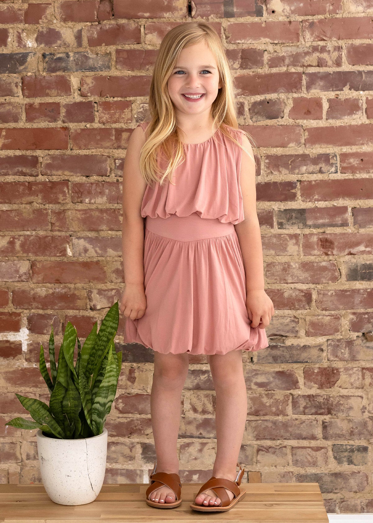 This soft dusty rose-colored dress features a relaxed, sleeveless design with elegant gathered detailing at the bodice for a breezy, effortless look. The wide waistband provides subtle definition, while the flowing skirt drapes beautifully for comfort and movement.