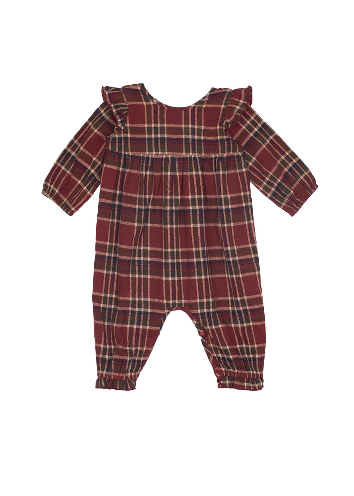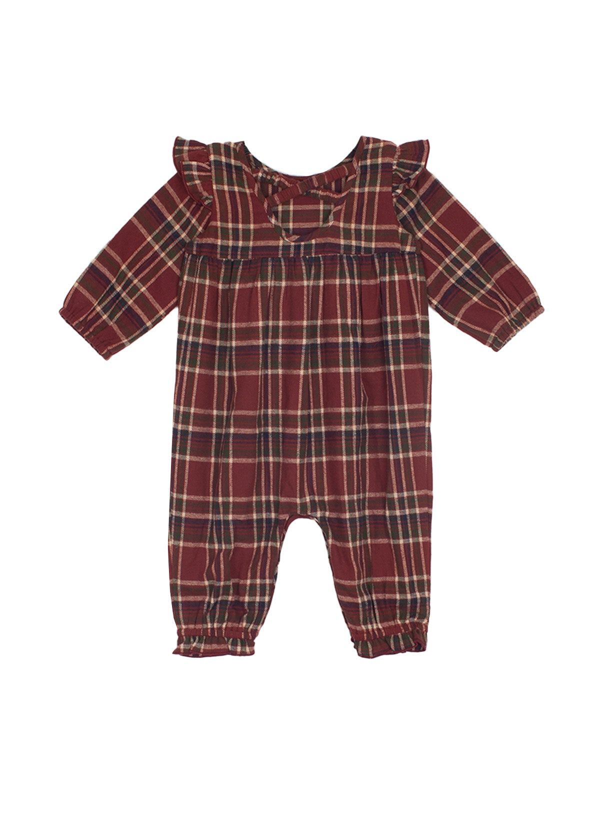 Embrace the cozy charm of the season with the Grace Romper, beautifully designed with a classic plaid pattern and delightful ruffle shoulder details. This stylish one-piece ensures your little one stays comfortable and fashionable.