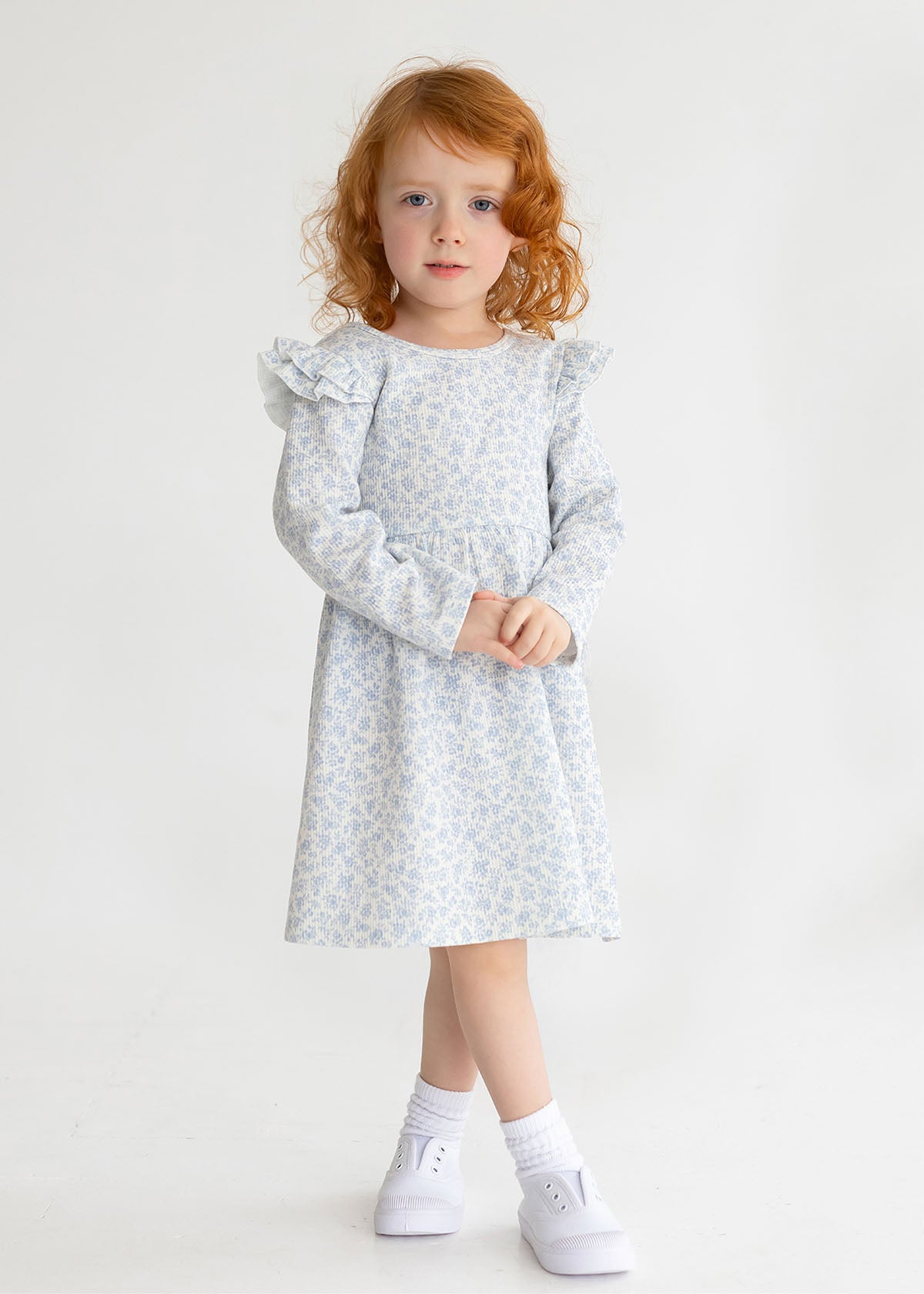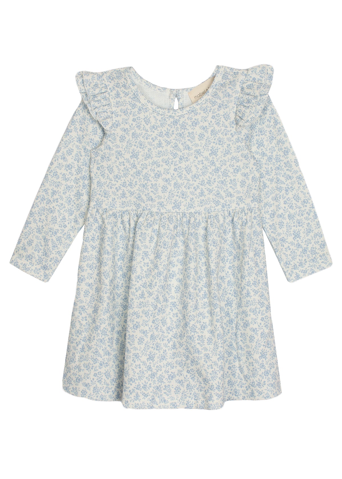 The Hannah Dress exudes classic charm with its pale blue floral pattern on soft, breathable fabric. This delightful dress features ruffled shoulder details and a comfortable, flowing silhouette that makes it perfect for play dates or family outings. Its gentle color and design offer timeless style for your little one.