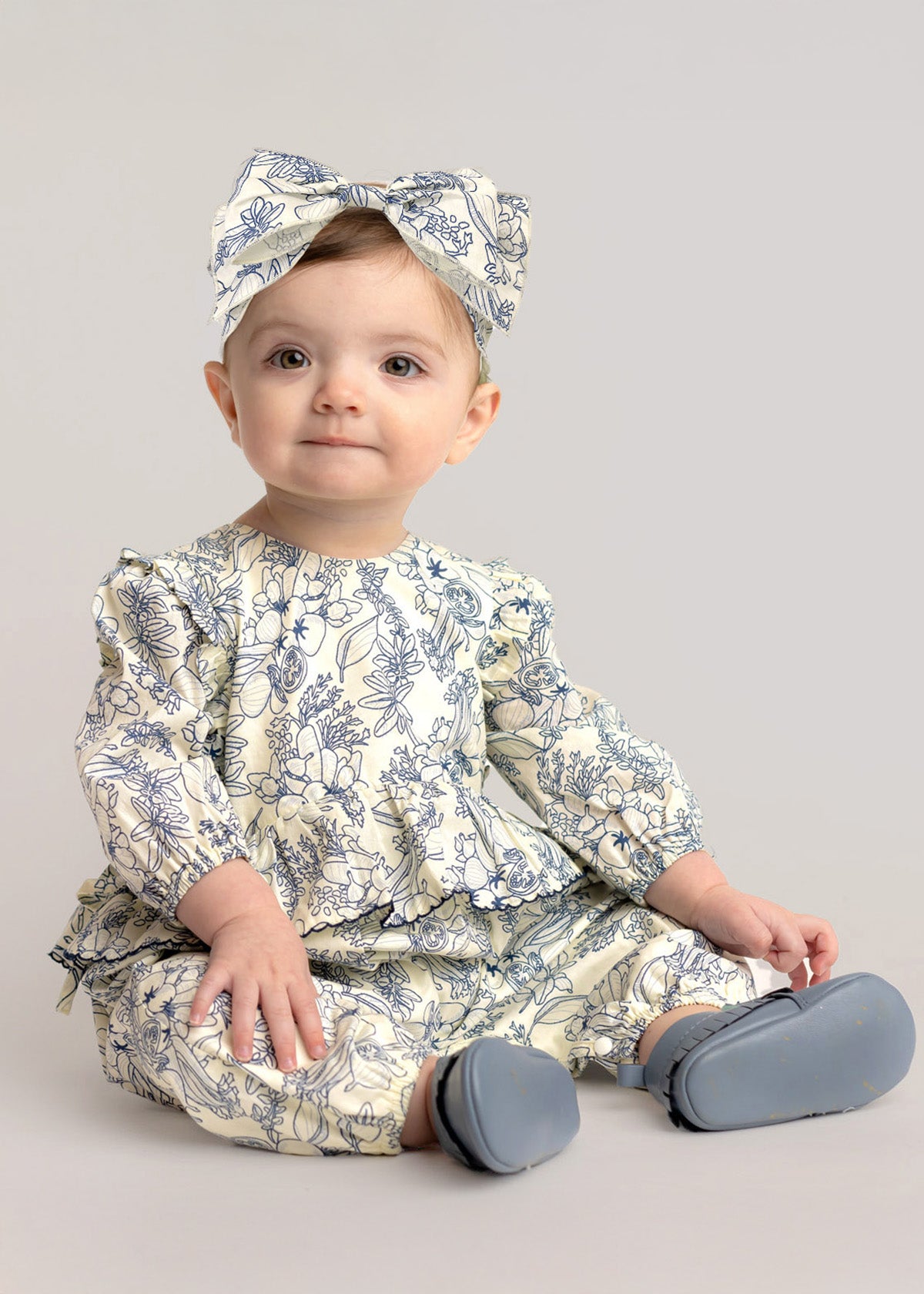 The Lucy Blue Romper is the perfect blend of comfort and style, designed for little trendsetters. Its soft, breathable fabric is adorned with an intricate black floral pattern, standing out against a creamy white backdrop. Featuring delicate ruffle detailing on the chest and shoulders, elasticized cuffs for a snug fit, and full-length legs, this romper offers effortless elegance for your baby girl while keeping her cozy all day long.
