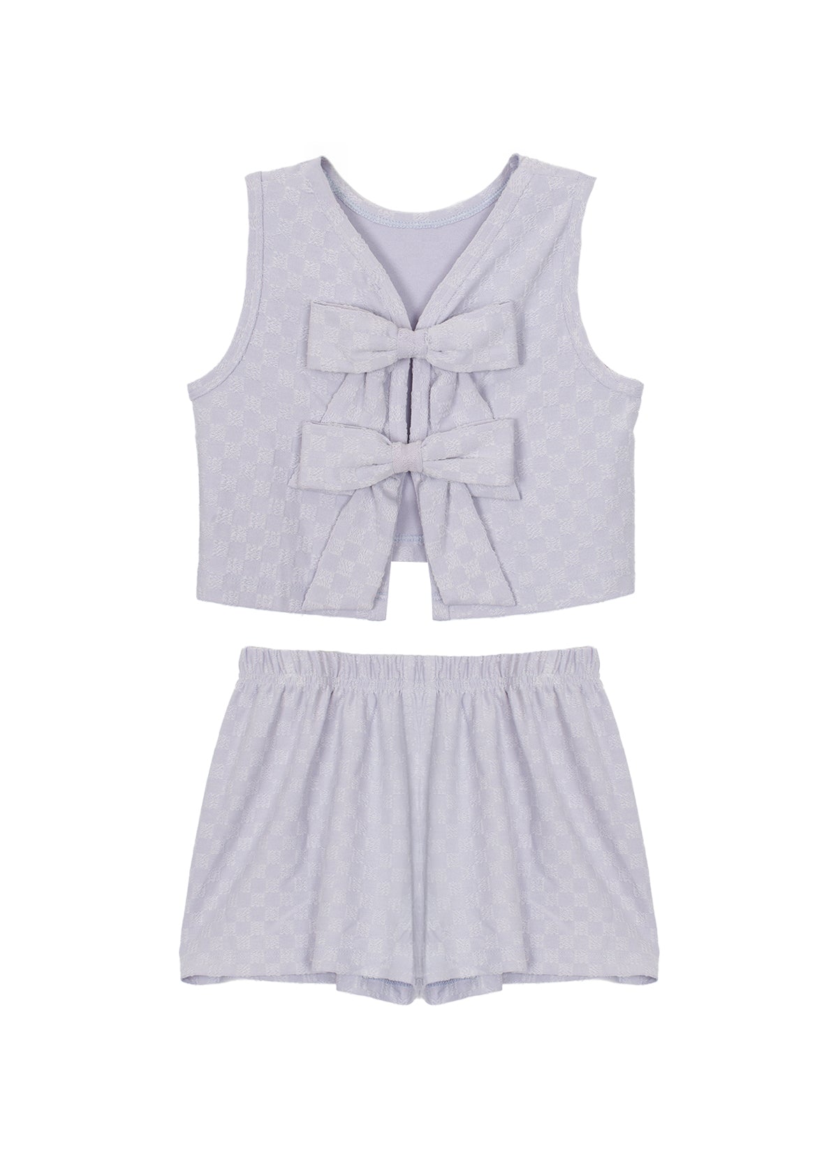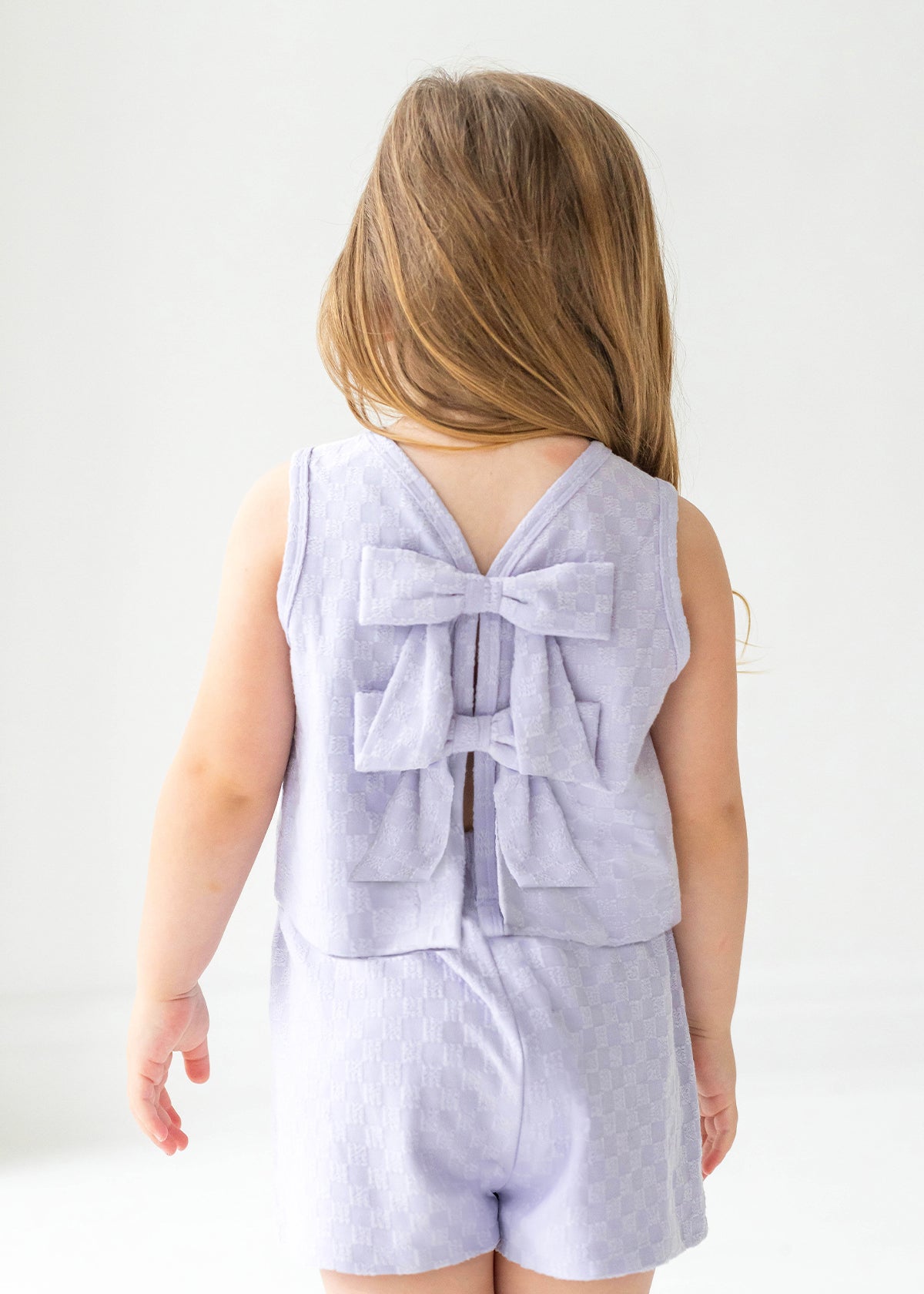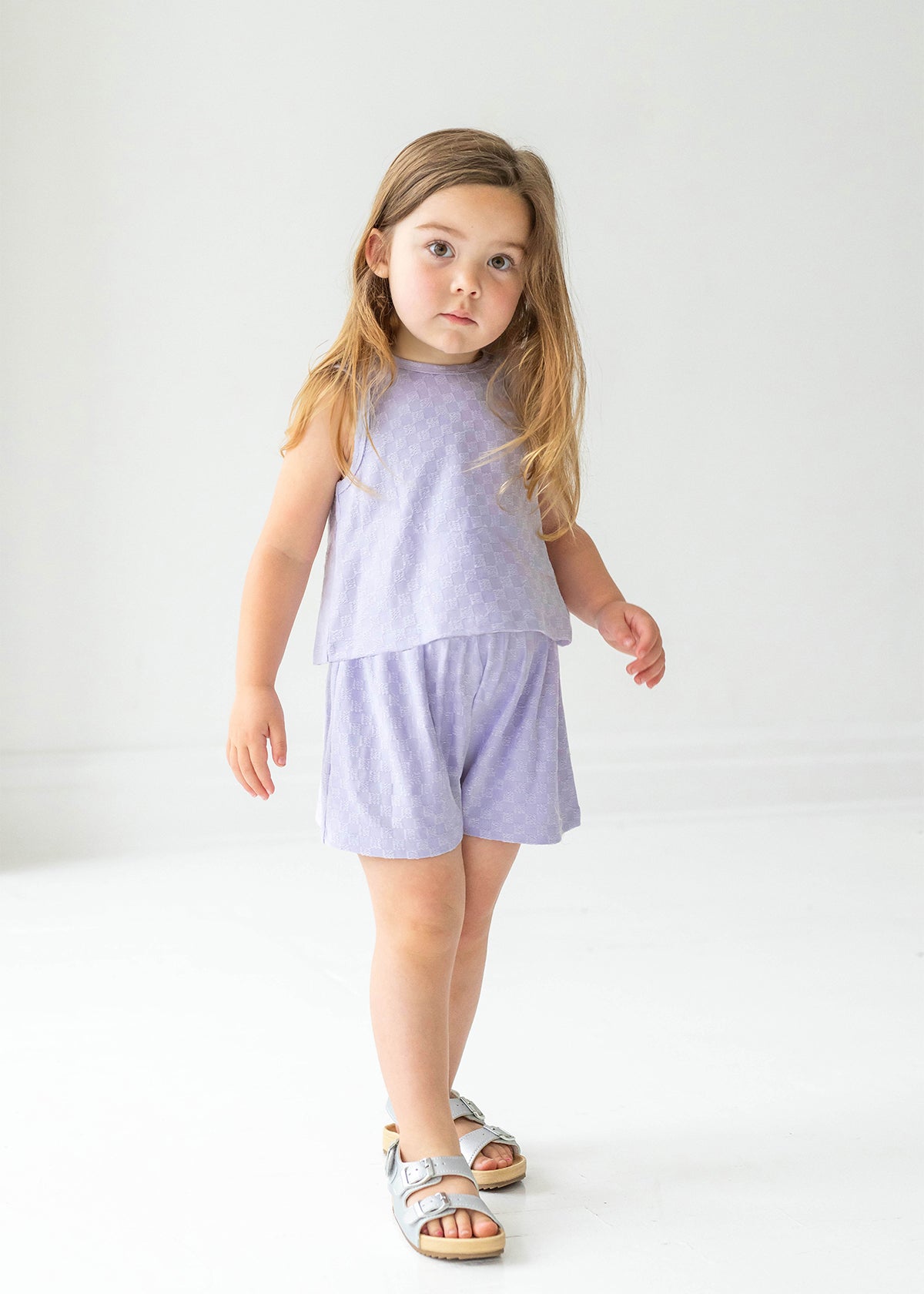 This girls' 2-piece set in a soft lavender hue features a subtle textured pattern for a stylish touch. The sleeveless top has a modern split-front hem, adding movement and flair. Paired with lightweight, elastic-waist shorts for all-day comfort, this set is perfect for warm-weather outings and casual everyday wear.