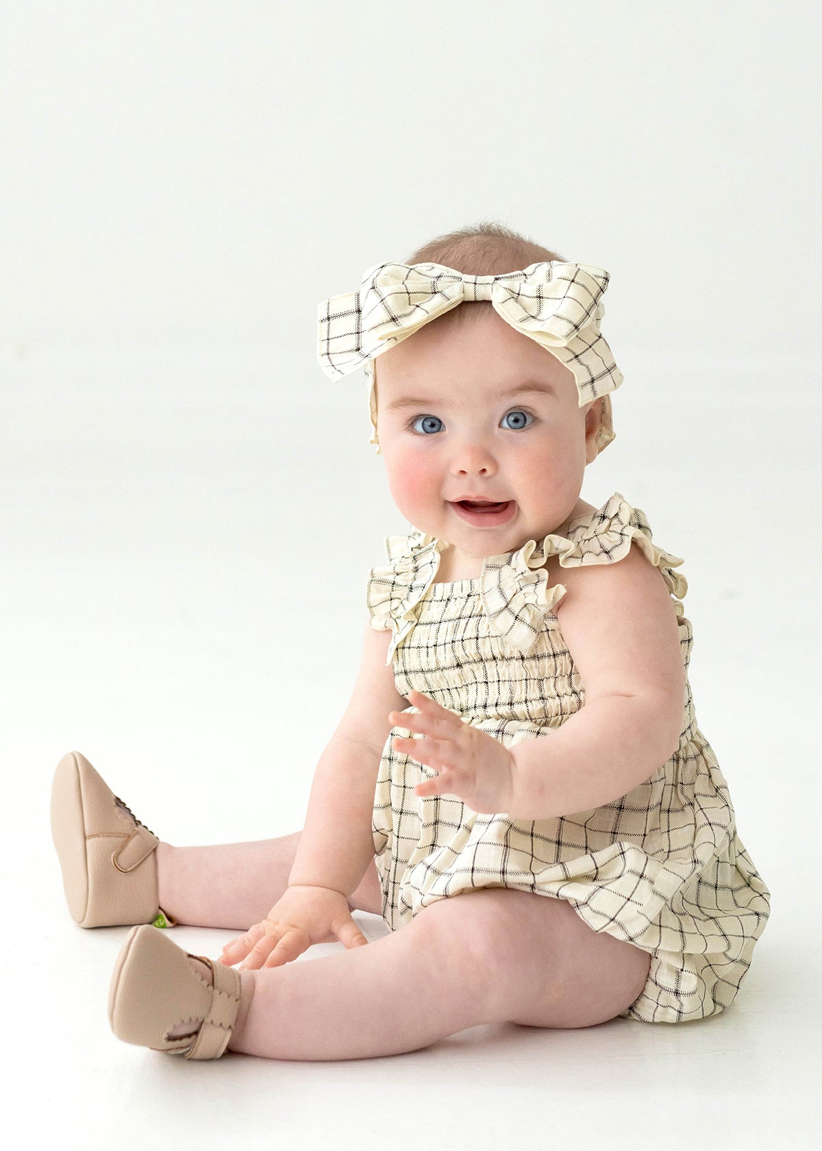 This adorable baby girls romper showcases a classic black and ivory plaid. Designed from lightweight fabric, it features sweet ruffled straps and a lined smocked bodice.