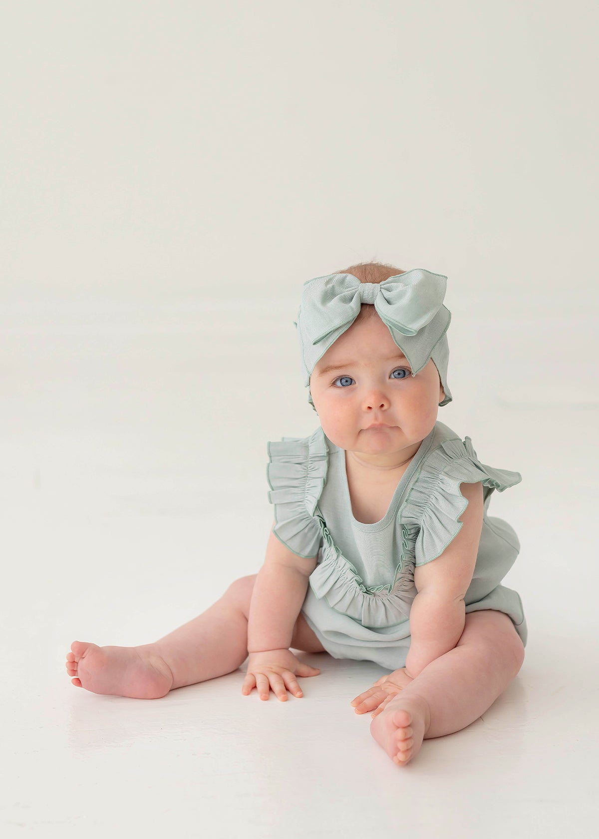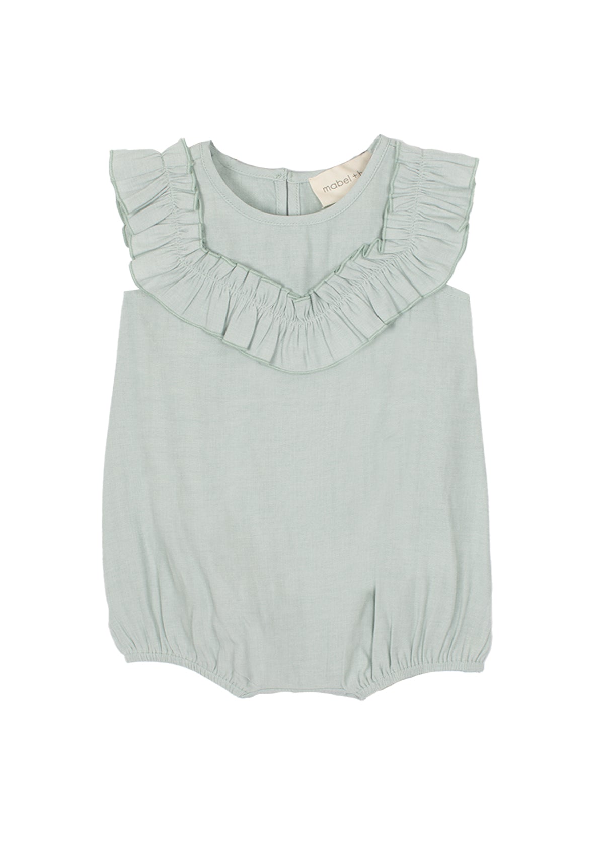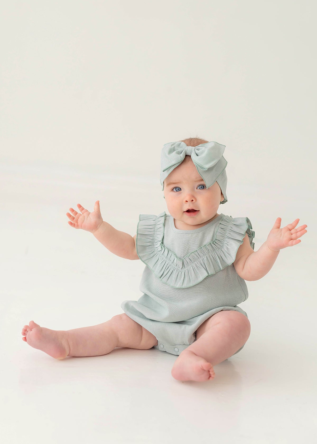 This baby girl romper in a soft sage green features delicate ruffled detailing across the neckline for a sweet, textured finish.