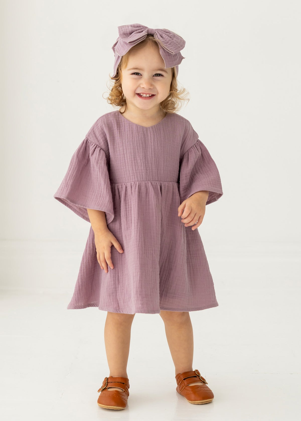 Made from soft and lightweight gauze fabric, this natural waistline dress provides both comfort and elegance. It features unique short sleeves with a drop shoulder design, adding a modern twist to the classic dress style.