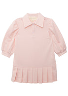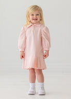 The Serena dress brings effortless style to your little ones wardrobe. Featuring a soft pink hue with a subtle textured pattern, this dress boasts long sleeves, a classic collared neckline with button details, and a pleated skirt for added volume. Perfect for both playdates and special occasions, it offers elegance and comfort in one delightful design.