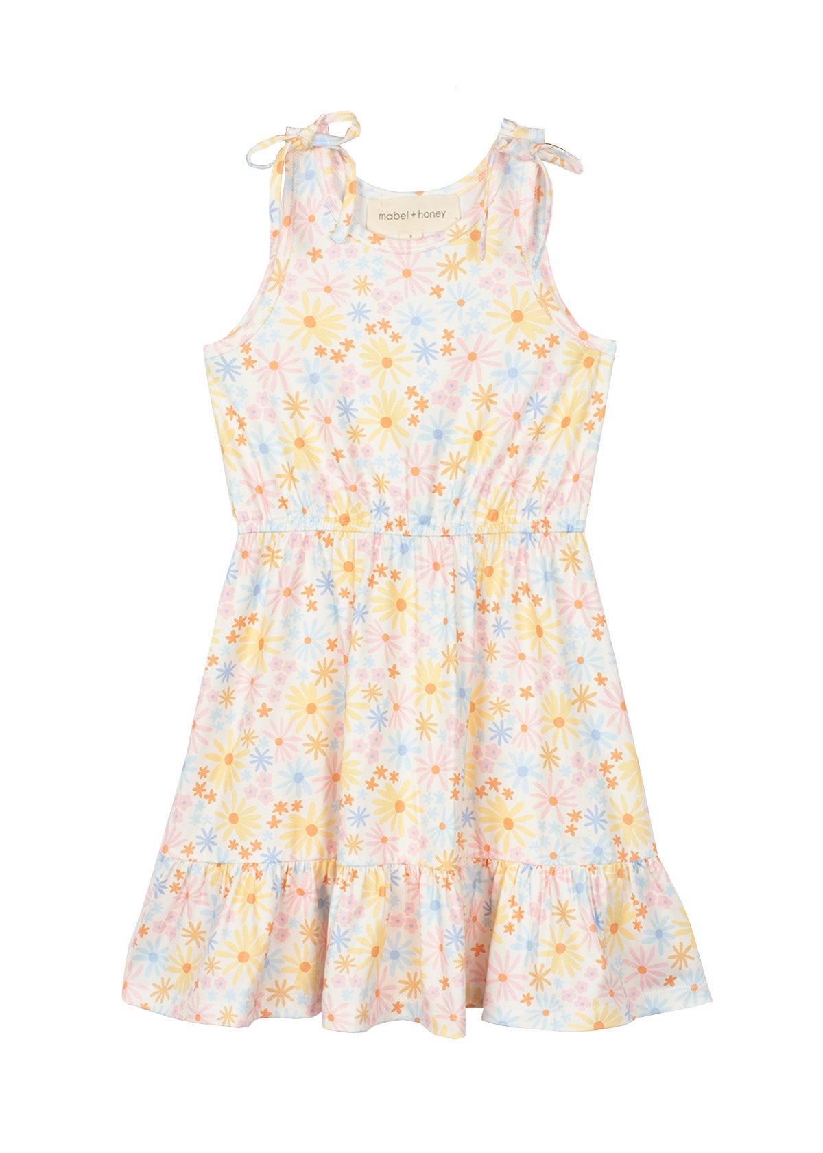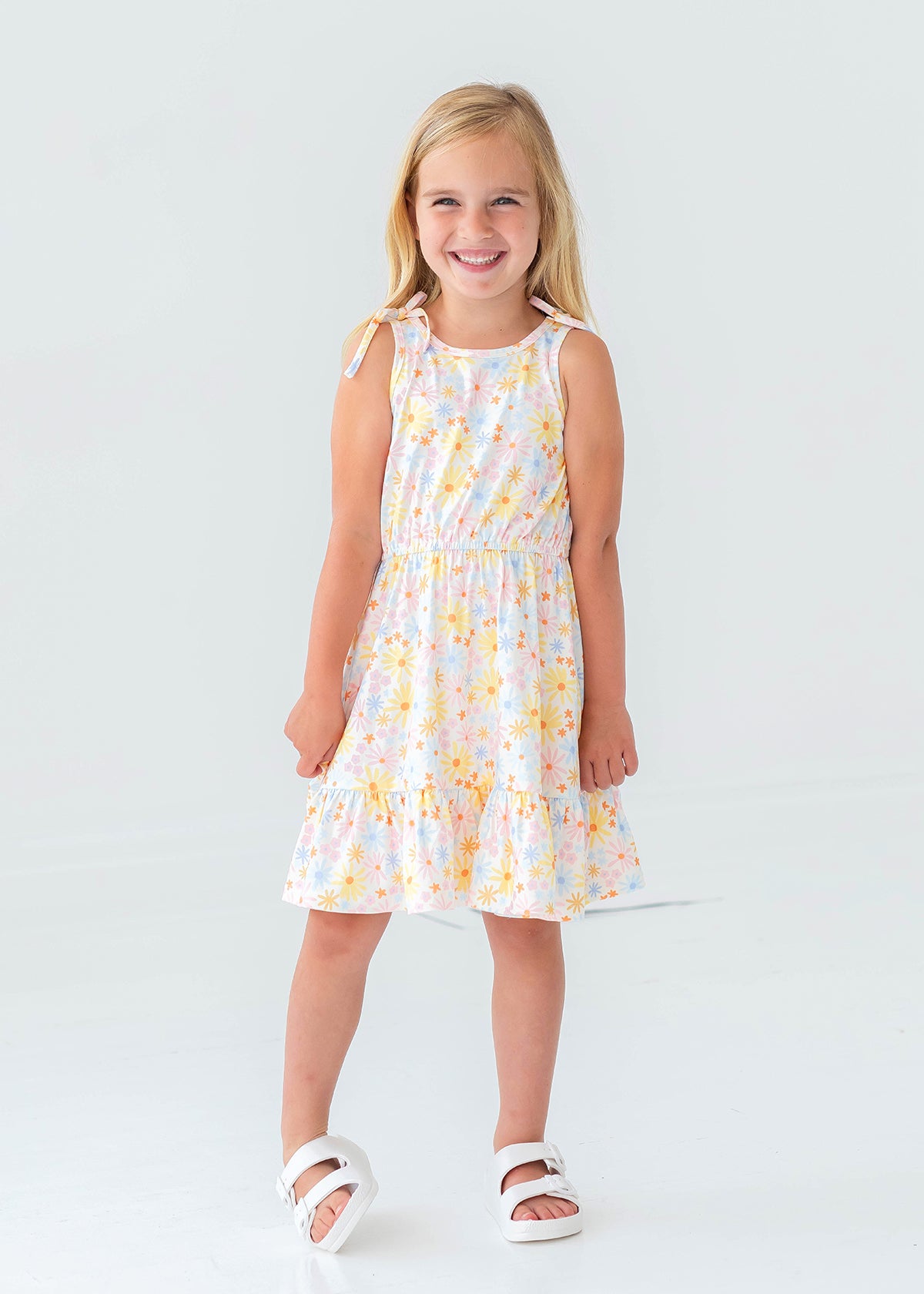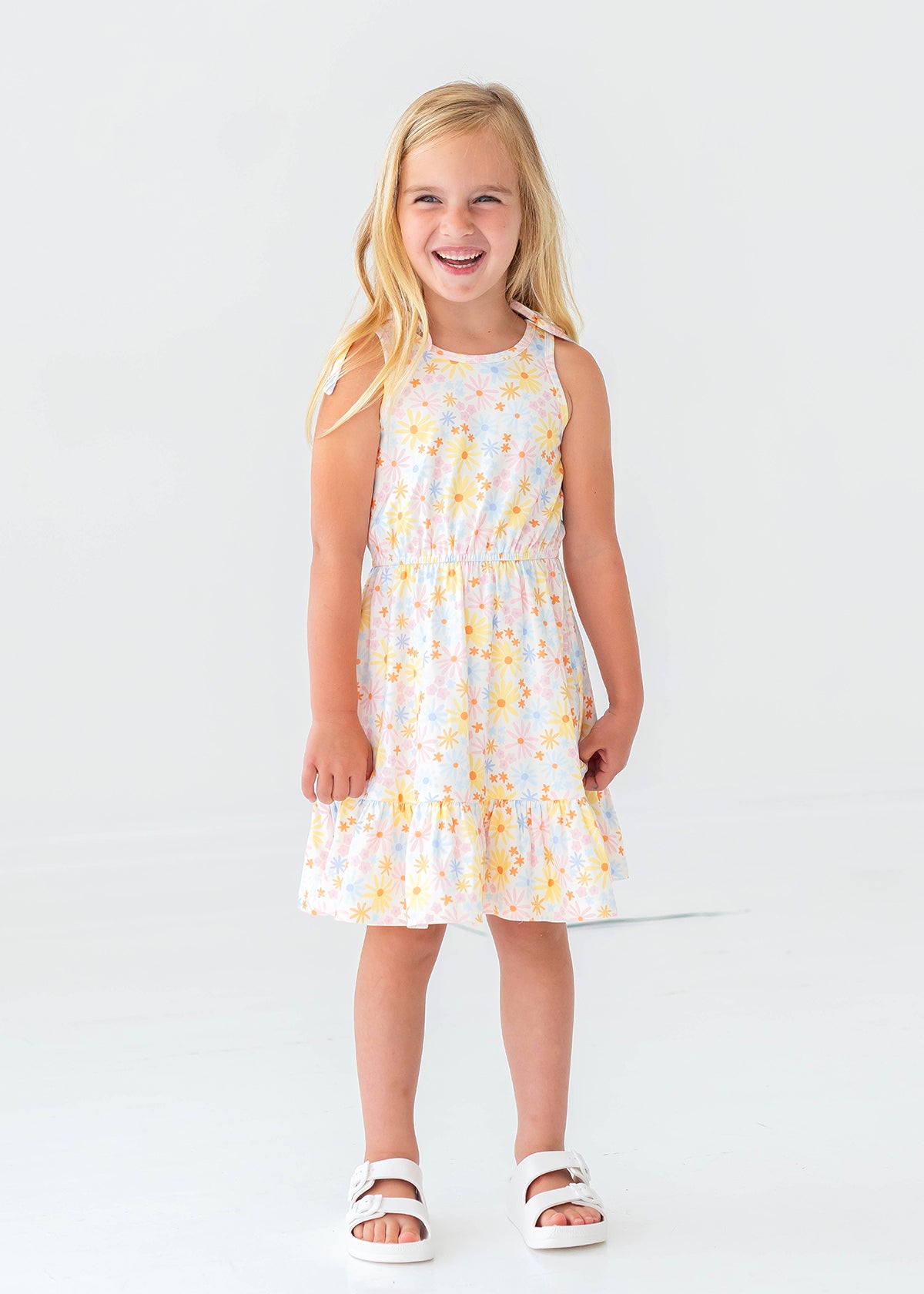 This girl's dress showcases delightful daisy print in cheerful botanical shades on a soft knit fabric. Featuring bow details on the shoulder straps, and a natural wasit body with a ruffled skirt, it is also lightweight and breezy, perfect for warm-weather occasions.