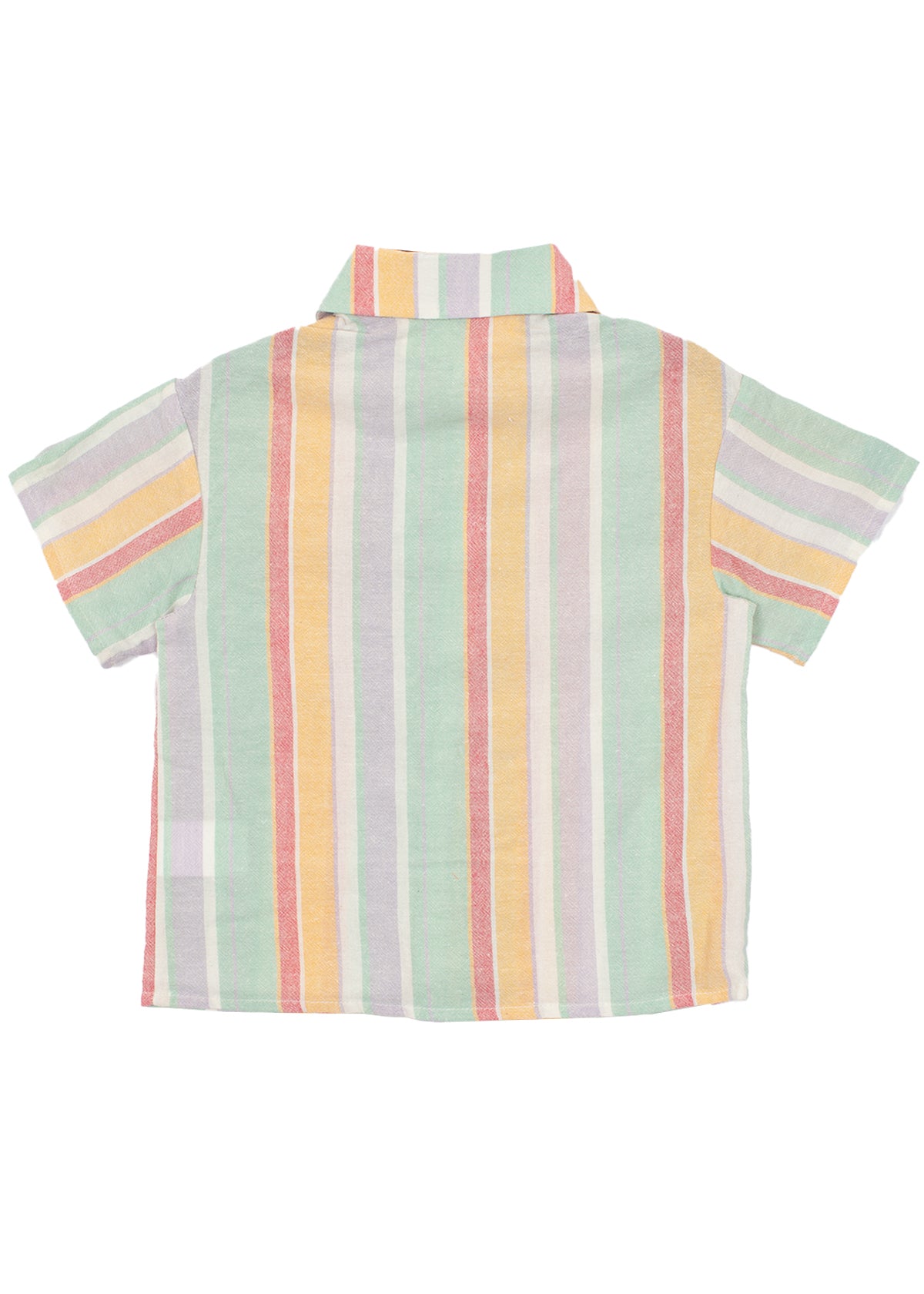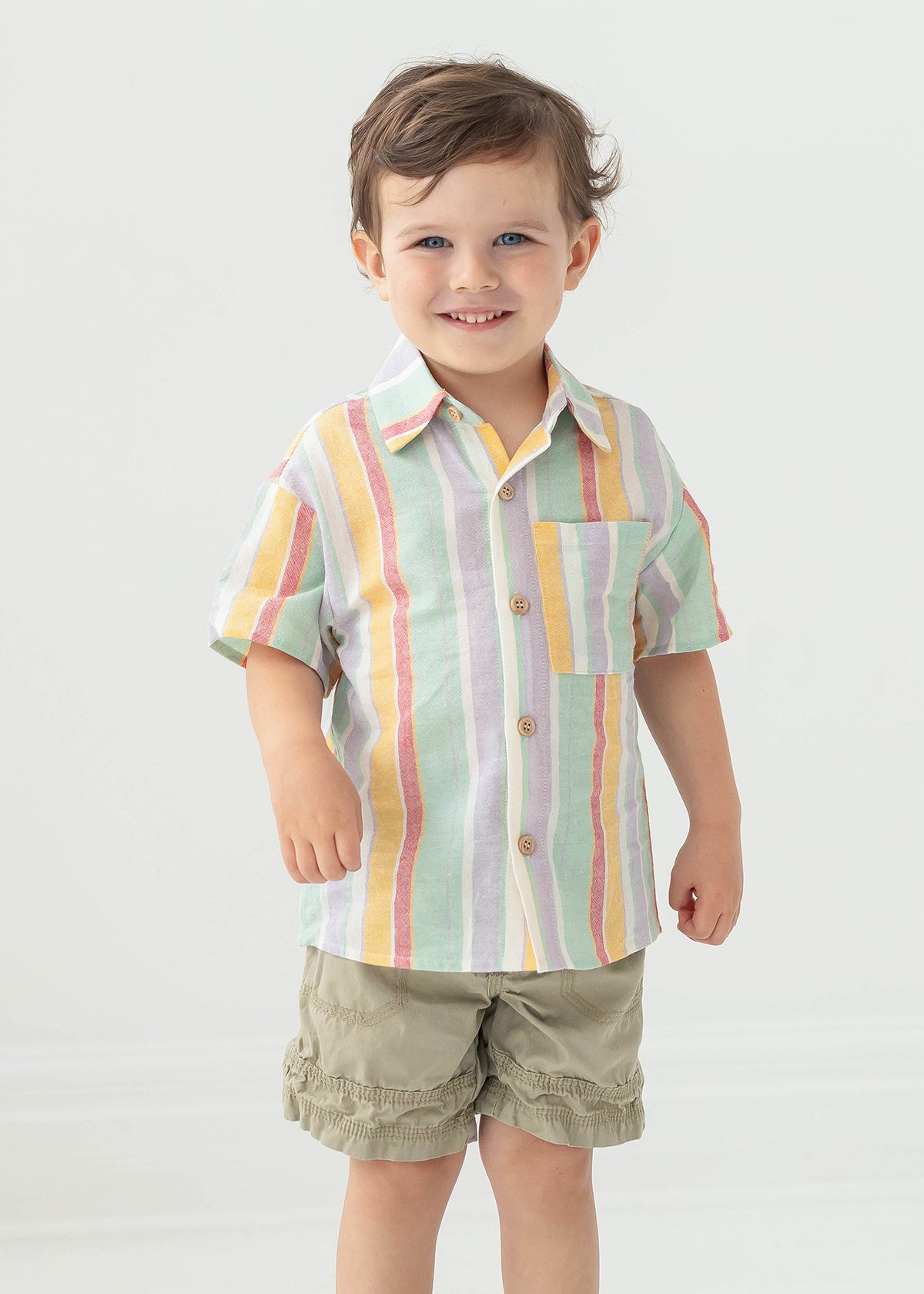 This boys' short-sleeve button-up shirt features a vibrant multicolor stripe pattern in soft pastel hues of green, yellow, pink, and white. Designed with a classic collar and a functional front pocket for a timeless touch, the lightweight fabric ensures breathability, making it a stylish and comfortable choice for warm-weather days.