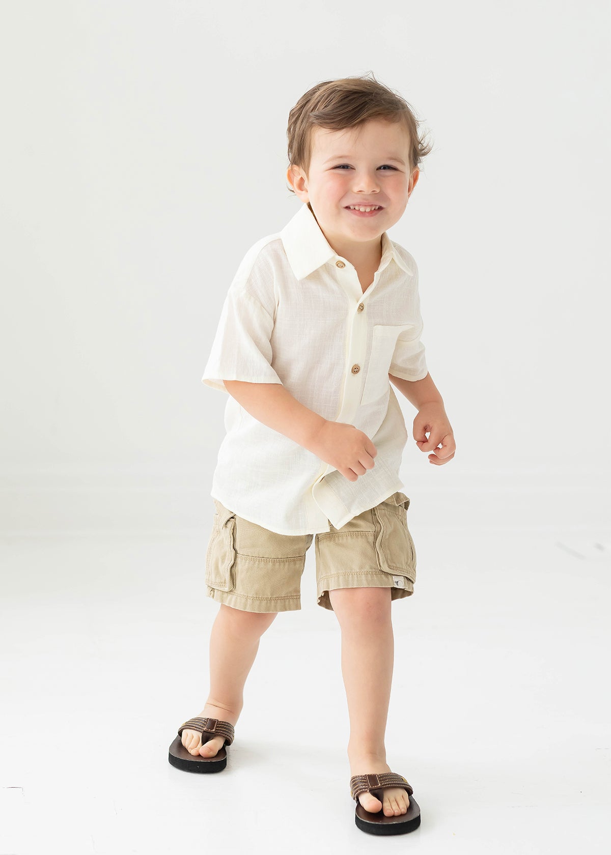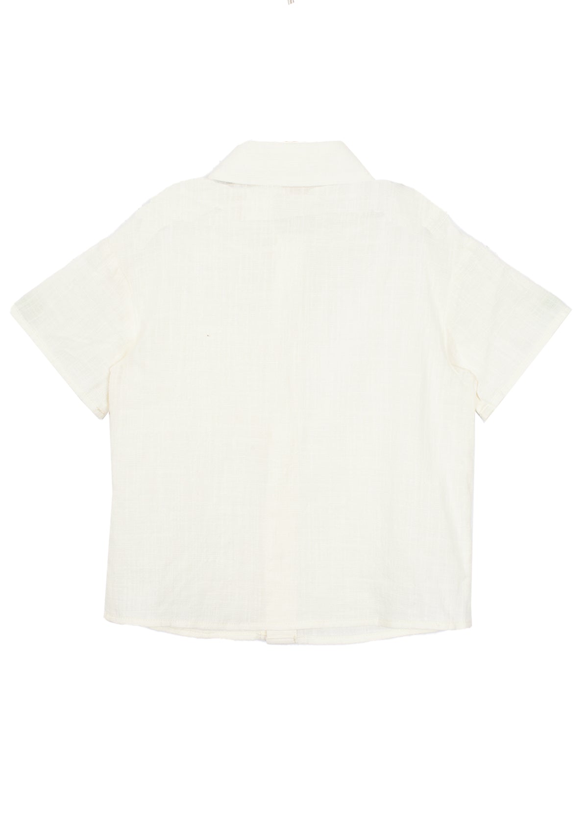 This ivory boys' short-sleeve button-up shirt is a timeless wardrobe essential. Crafted from a lightweight, breathable fabric, it features a classic pointed collar, a functional front pocket, and wooden button closures for a refined touch. Perfect for both casual and dressy occasions, it offers all-day comfort with effortless style.