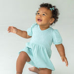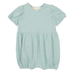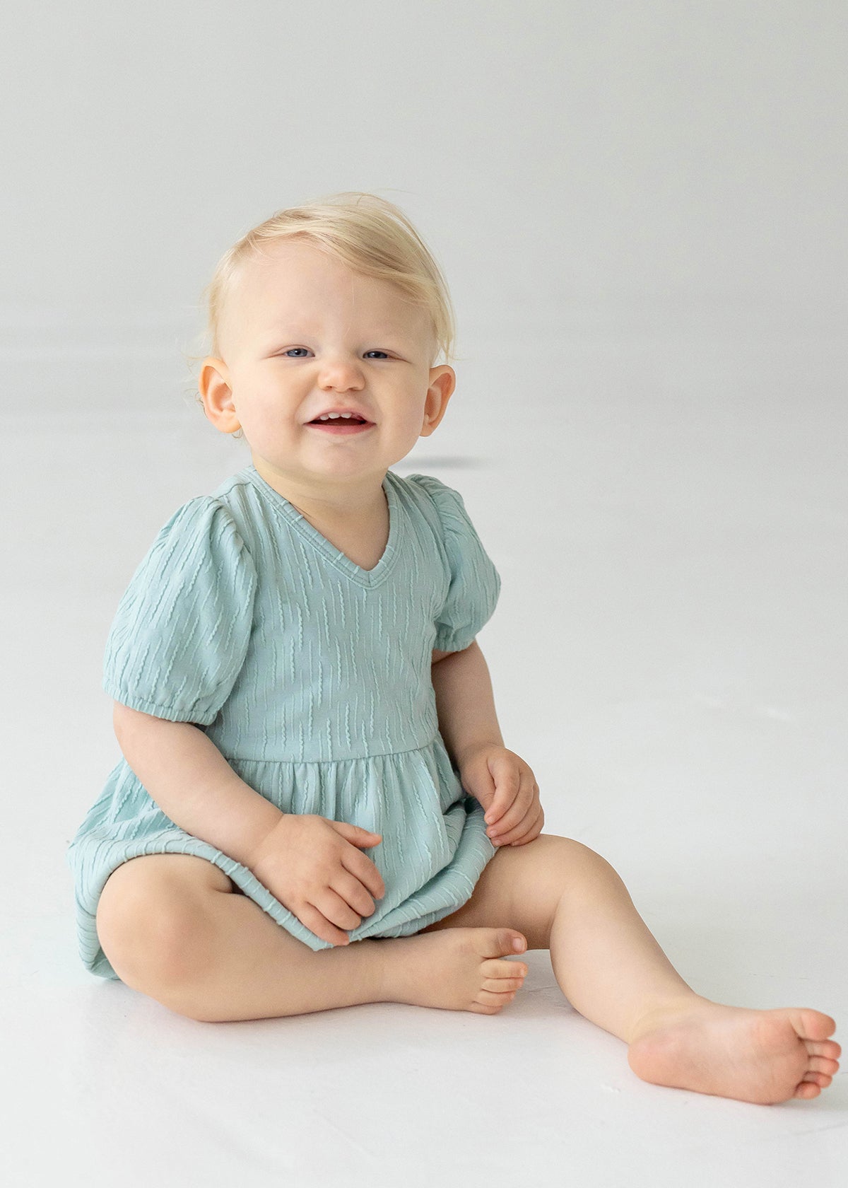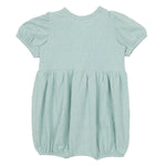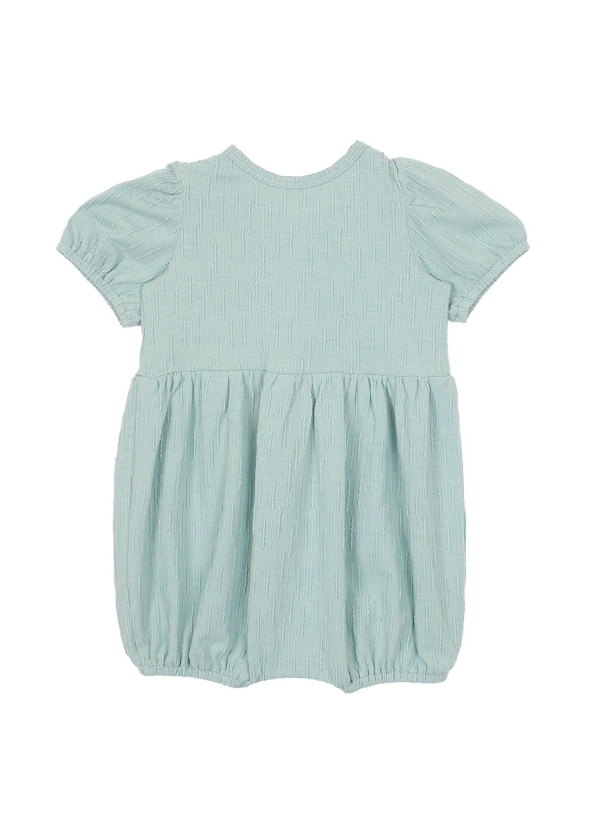 This baby girl romper in soft sage green features a delicate textured pattern for a timeless look. Designed with puff sleeves and a gathered waist, it offers a sweet silhouette. The bubble-style bottom ensures comfort and flexibility.