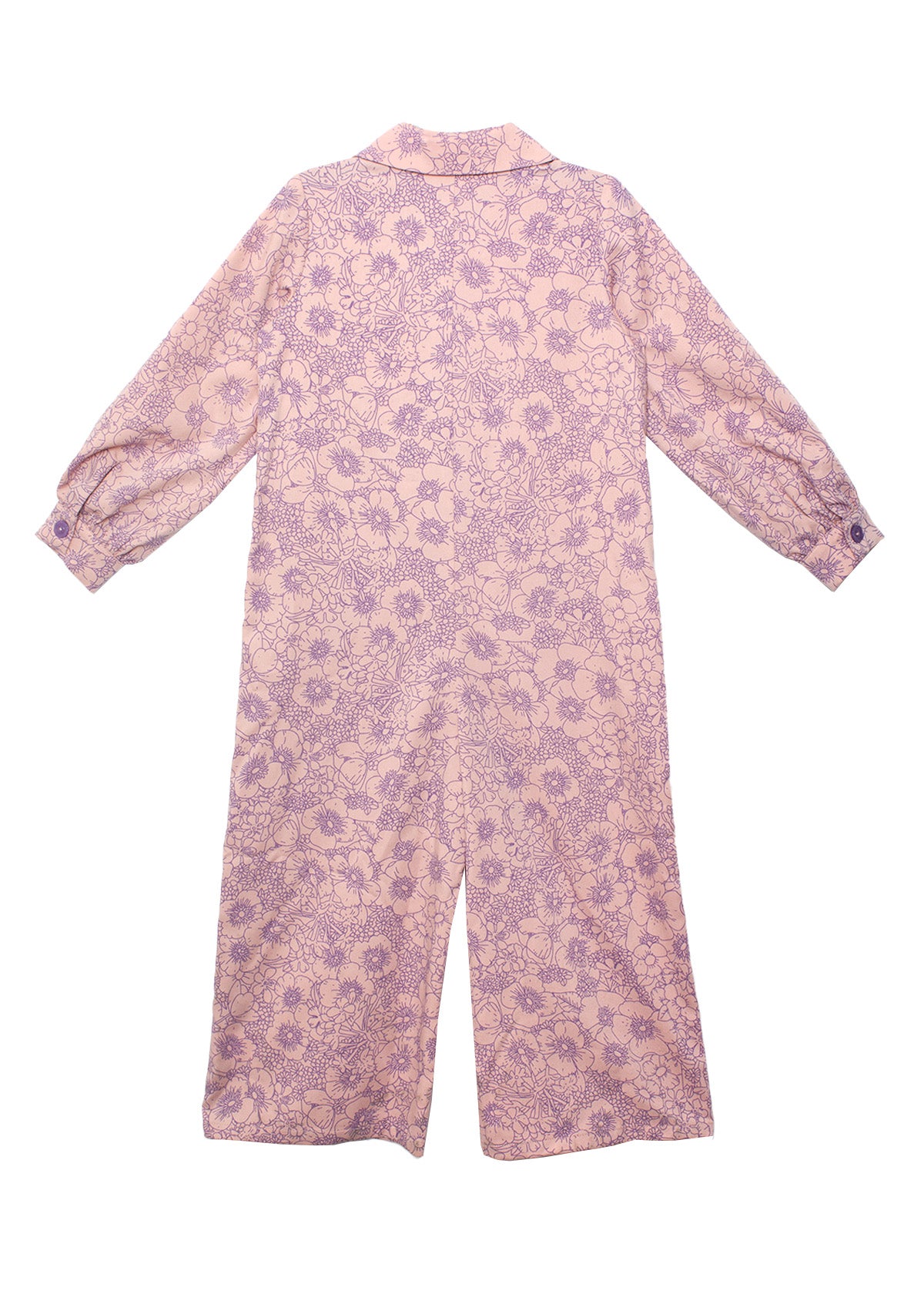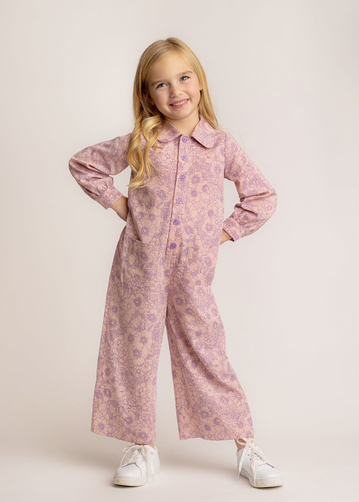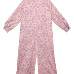 The Flower Power Romper adds a touch of playful elegance to your little one?s wardrobe. Crafted from soft, lightweight fabric, it features an intricate pattern of purple blooms on a blush backdrop. Details like the button-front design, subtly puffed sleeves, and a rounded collar create a classic yet modern look. Perfect for everyday wear or making memories in comfort and style.