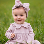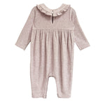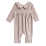 The Heather Romper combines timeless design with thoughtful details to create an outfit that's as adorable as it is practical. Crafted from a soft, ribbed fabric in a gentle taupe hue, it features a delicate ruffled collar and a gathered bodice for a classic, airy look.