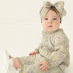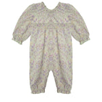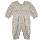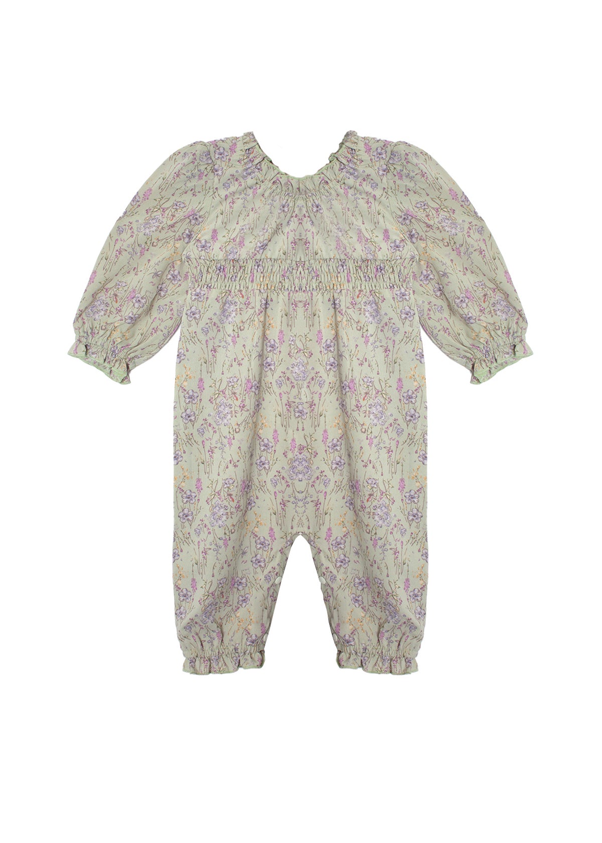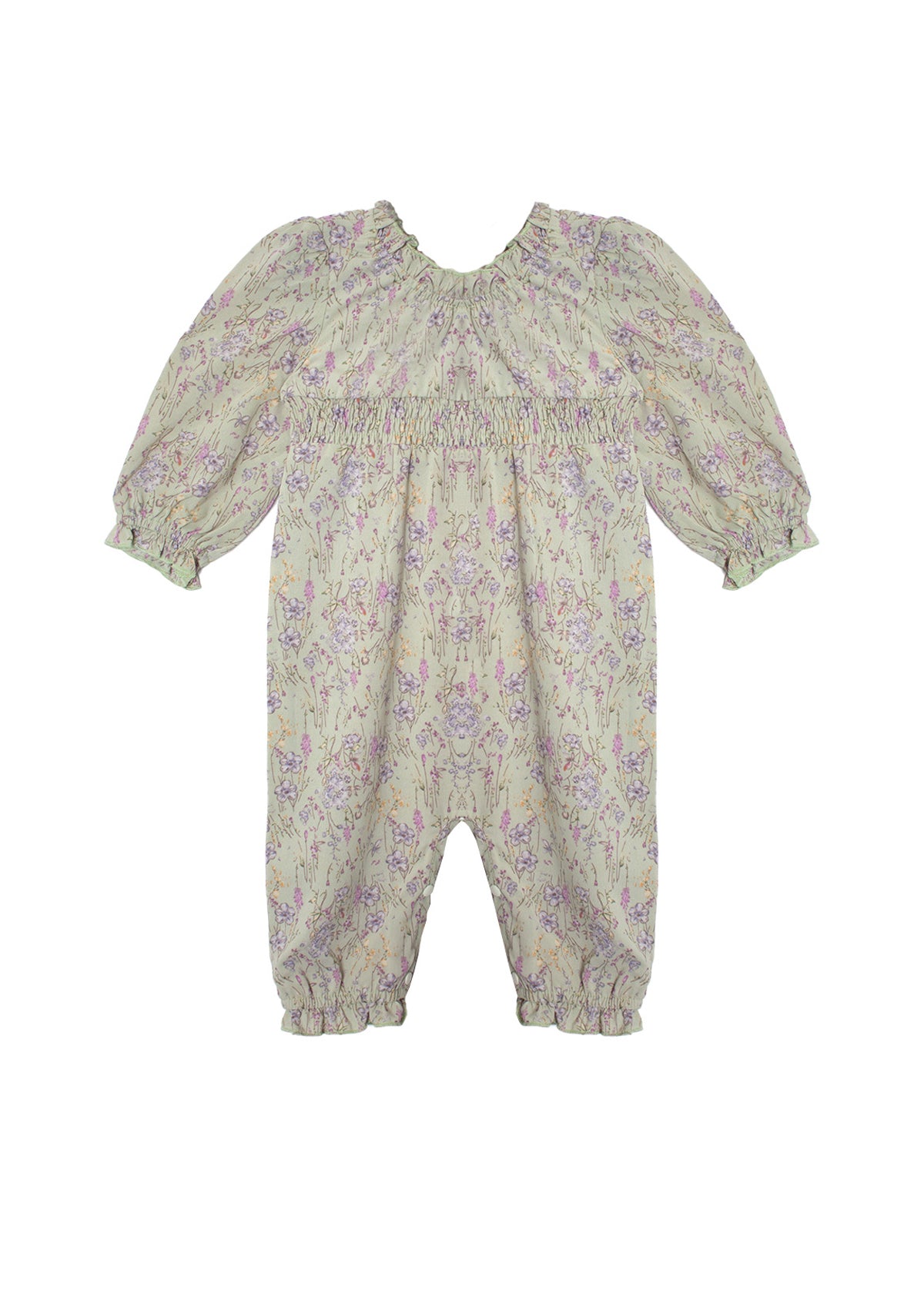 This baby romper features a soft, lightweight fabric in a delicate floral print with shades of lavender, pink, and green. The elasticated neckline, cuffs, and ankles ensure a snug and comfortable fit. The romper is designed with gentle gathers at the chest and a relaxed fit, making it perfect for everyday wear or special occasions.