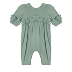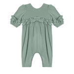 This adorable green romper features buttery soft fabric while ensuring ease of movement.The charming ruffle sleeves and a sweet ruffled natural waistline, each detail adds a playful touch to this cute ensemble.
