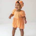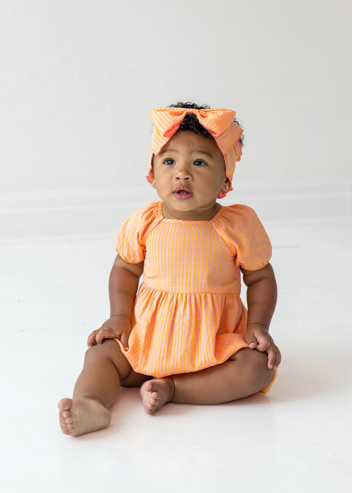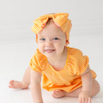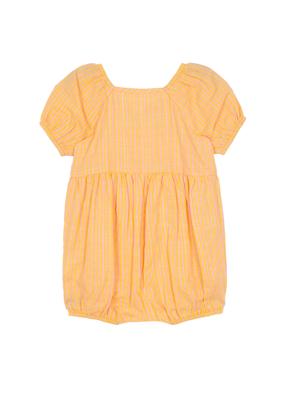 This adorable baby girl's romper features a delightful orange and yellow striped pattern, perfect for brightening up any day. The garment boasts puffed short sleeves and a gathered waist for added charm. Elasticized leg openings ensure a comfortable fit, while the back button closure allows for easy dressing. Ideal for warm-weather outings.