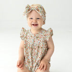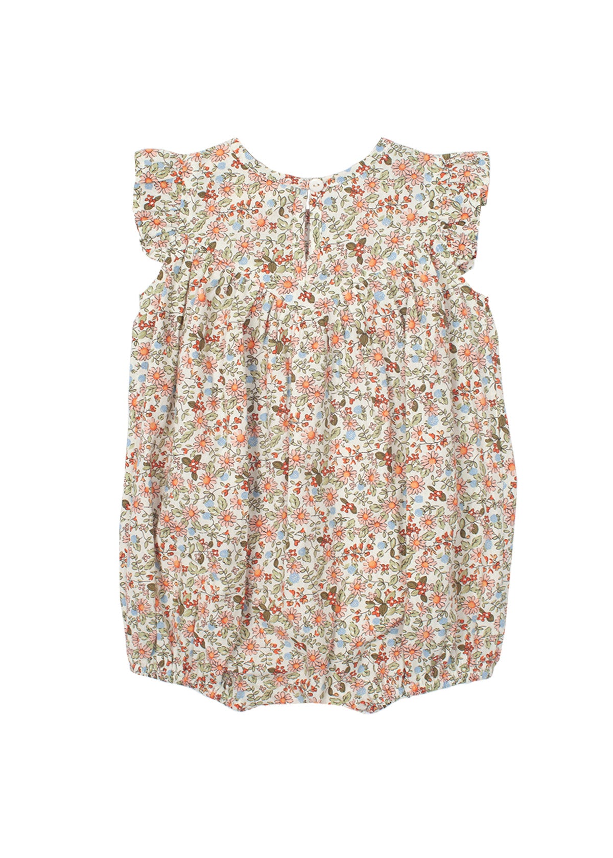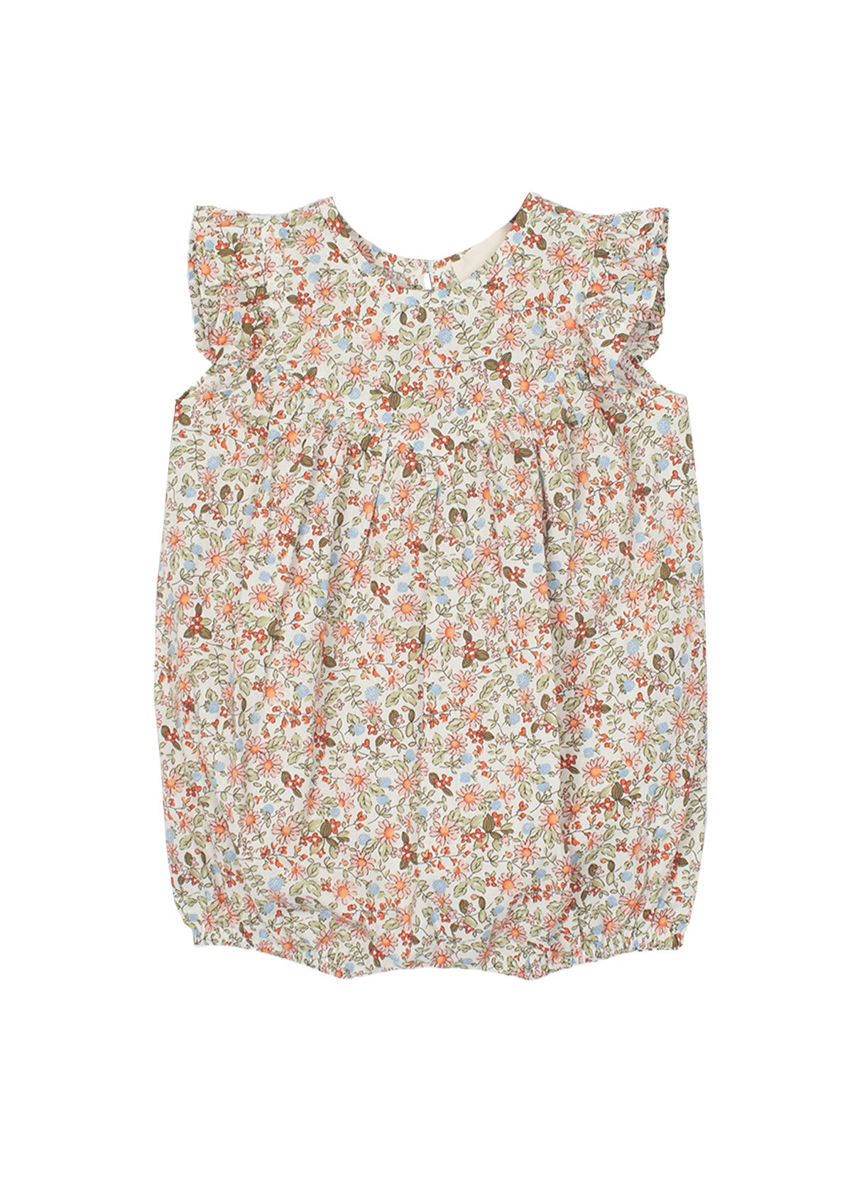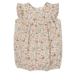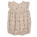 This baby romper showcases a colorful botanical print in soft orange, green, and blue tones on a cream background. Designed with ruffled flutter sleeves and a gently gathered yoke, it offers a relaxed, airy fit, making it ideal for warm-weather outings or playtime.