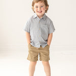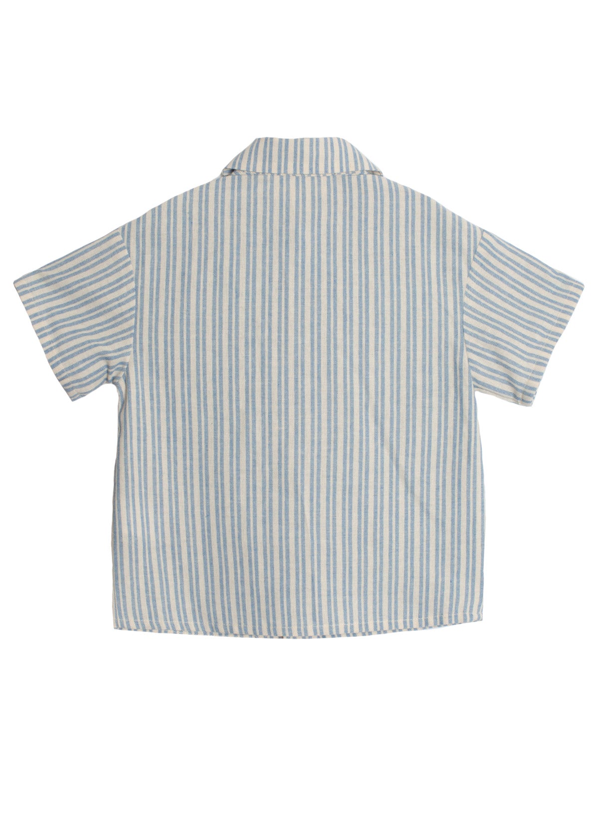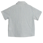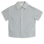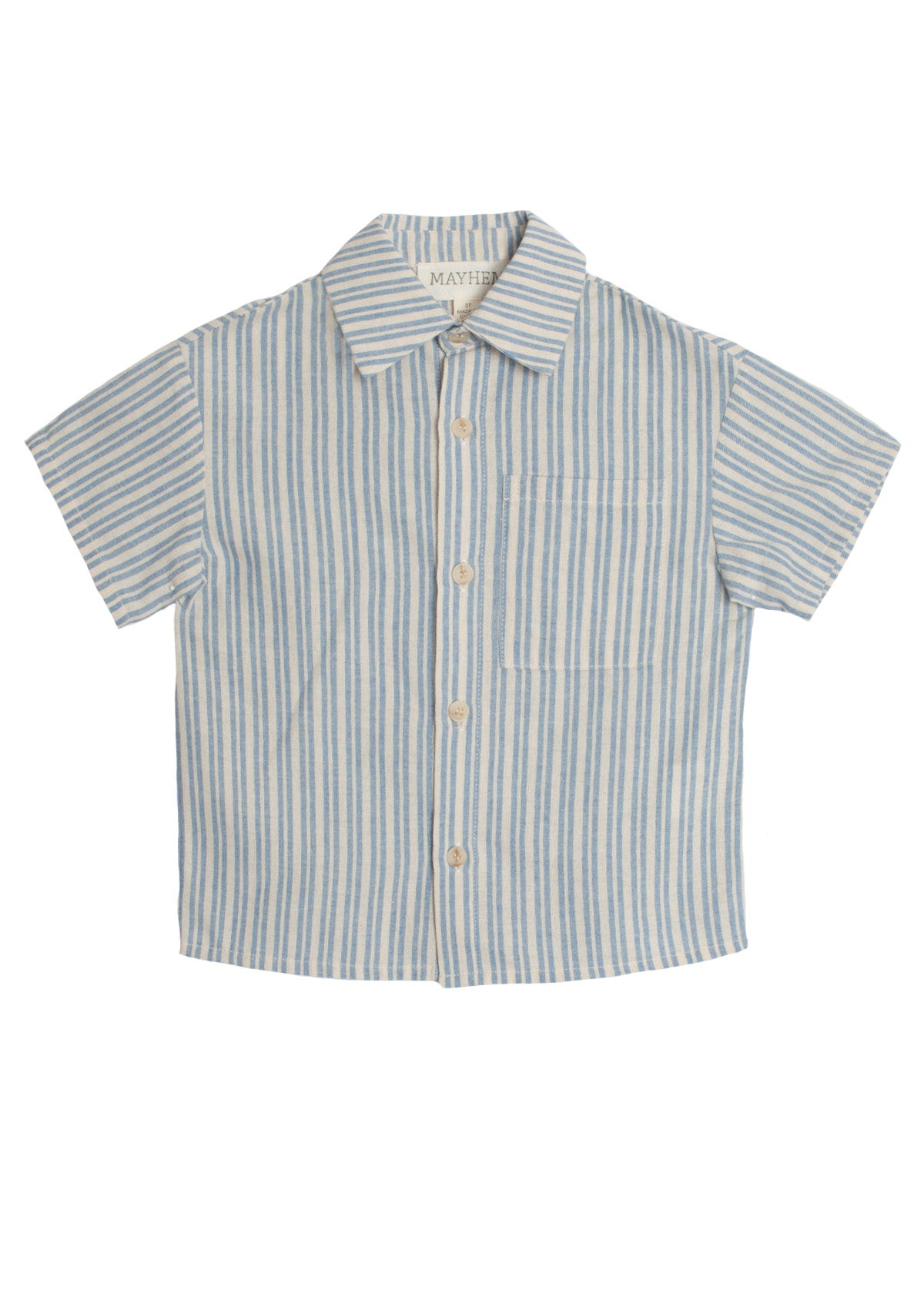 Mayhem's striped shirt exudes timeless charm with its classic short sleeves and pointed collar. Crafted from a soft and airy cotton blend, it features serene blue stripes, a clean button front, and a single chest pocket. It?s a perfect blend of casual elegance and comfort for the adventurous little one.