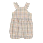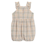 Embrace a cozy, classic look with Mabel and Honey's plaid girls' romper. This adorable piece, designed with flutter sleeves and a square neckline, is made from soft, woven cotton for all-day comfort. Featuring a pastel plaid pattern with a gentle ruffled hem, it's a perfect blend of vintage and comfort.