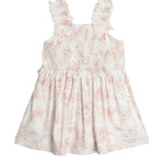 This Mabel and Honey sleeveless dress captures a breezy, tropical vibe with its delicate palm frond print in soft pink hues. The natural waist and gathered skirt create a flattering silhouette, while the ruffled accents add a touch of whimsy. It's made from a comfortable, breathable cotton fabric perfect for warm days.