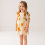 Bursting with the vibrancy of a summer garden, this empire waist dress by Mabel and Honey features puff sleeves and a delicate crinkle texture. Its lightweight fabric is adorned with bold marigold florals, adding a cheerful splash of orange and green to the natural cream backdrop.