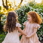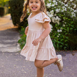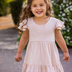 Embrace a touch of sophistication with this natural waist dress, featuring flutter sleeves and an enchanting criss-cross back. Made from soft and comfortable jersey fabric, it's perfect for playtime or special occasions. The neutral camel tone offers versatile styling options. Another delightful creation from Mabel and Honey.
