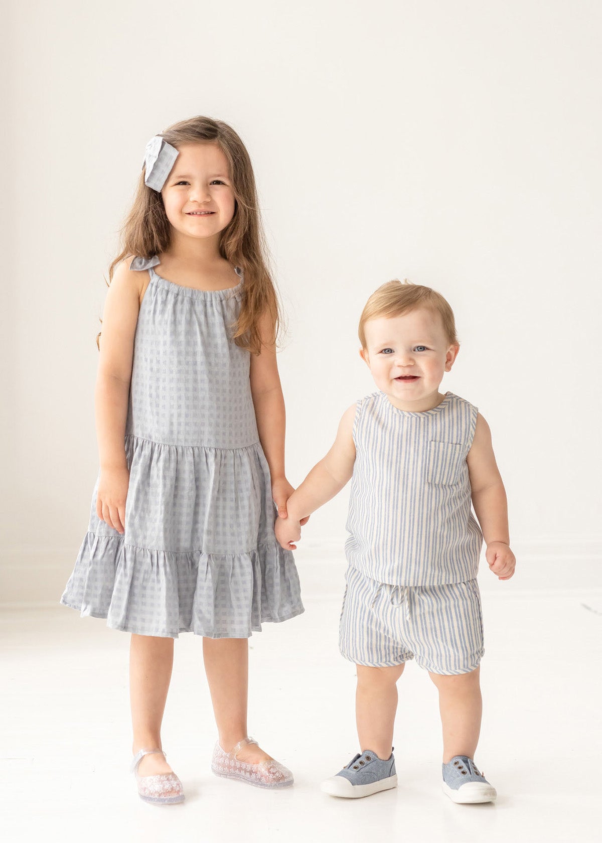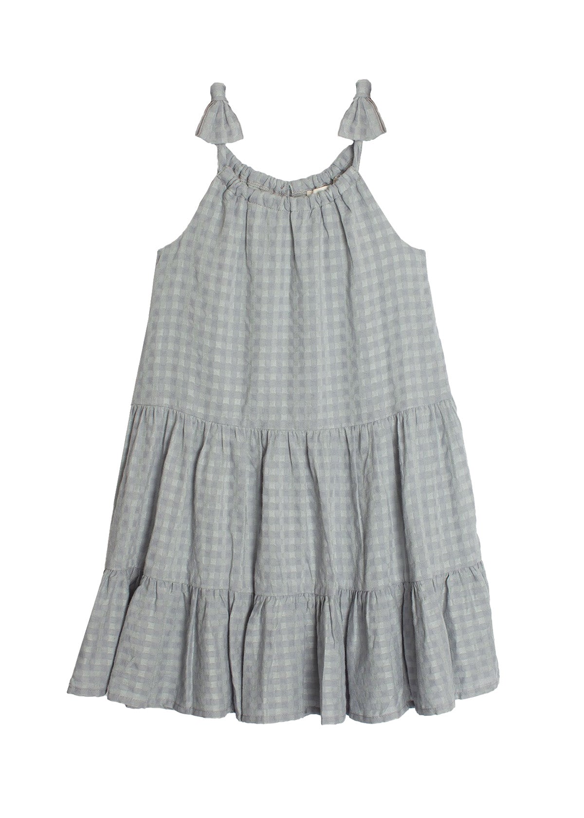 This Mabel and Honey dress showcases a playful drop waist silhouette, crafted from lightweight cotton gingham. The sleeveless design features unique tassel accents on the shoulders and a soft grey and white palette. Ideal for summer playdates, it combines comfort with a dash of whimsy.