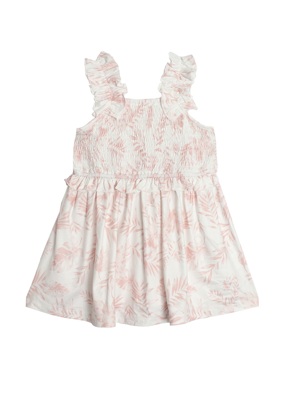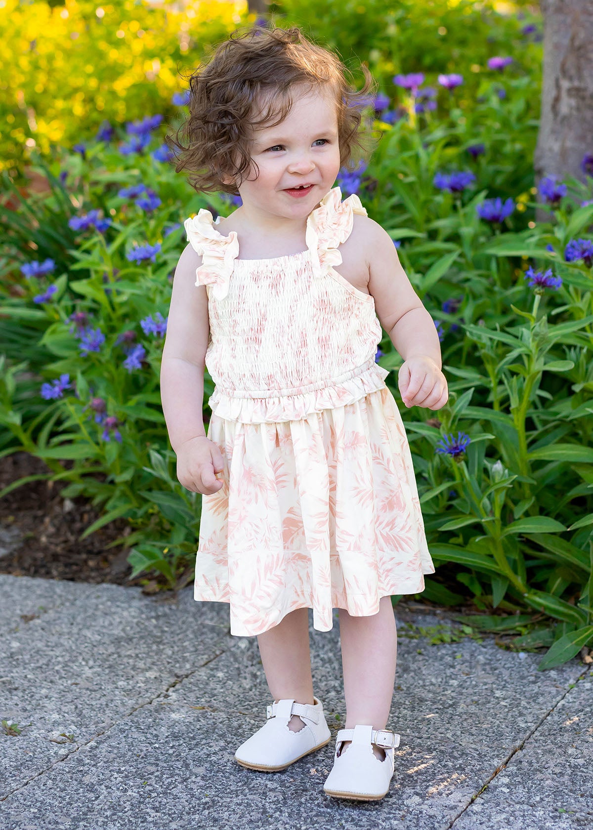 This Mabel and Honey sleeveless dress captures a breezy, tropical vibe with its delicate palm frond print in soft pink hues. The natural waist and gathered skirt create a flattering silhouette, while the ruffled accents add a touch of whimsy. It's made from a comfortable, breathable cotton fabric perfect for warm days.