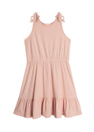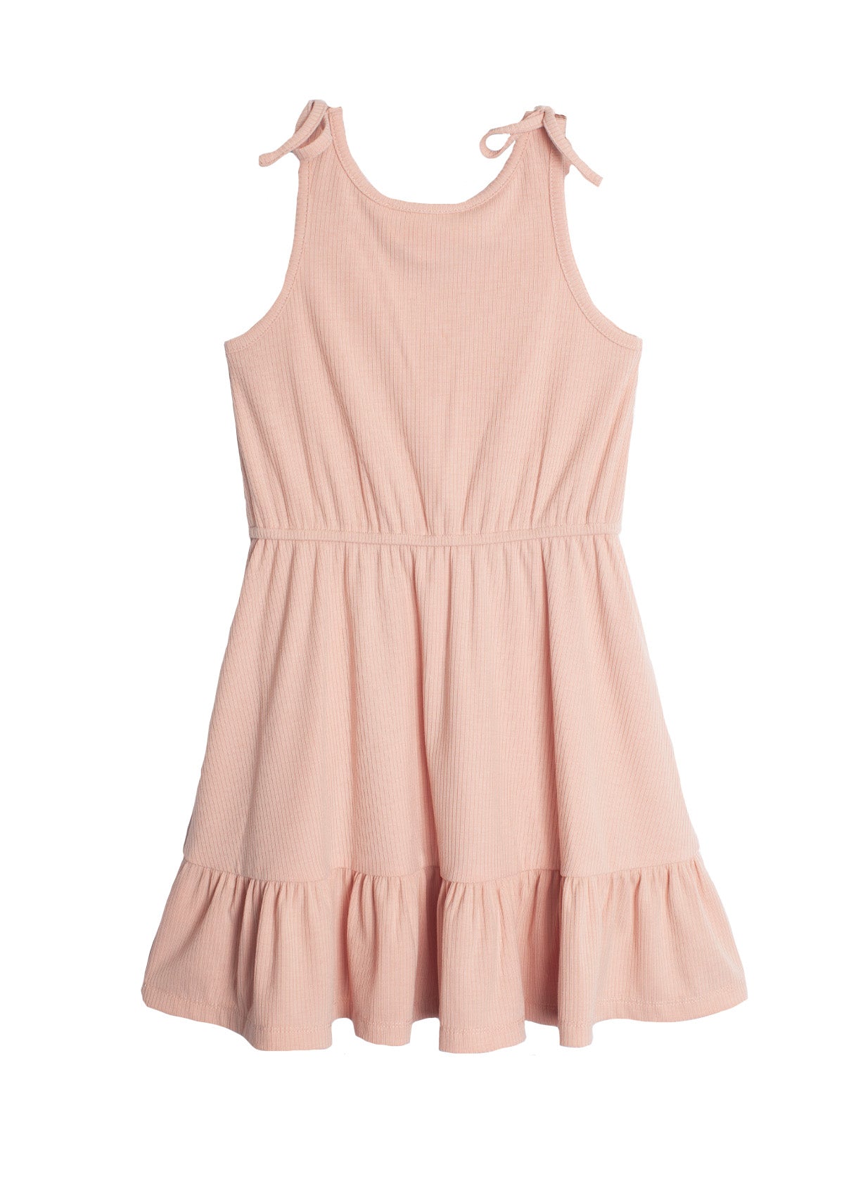 This sleeveless, natural waist dress in a soft peach hue exudes summertime sweetness. Crafted from light and airy ribbed cotton, it features charming shoulder tie details and a playful ruffled hem. Perfect for a picnic or a party, this dress is a Mabel and Honey classic for any girl's wardrobe.
