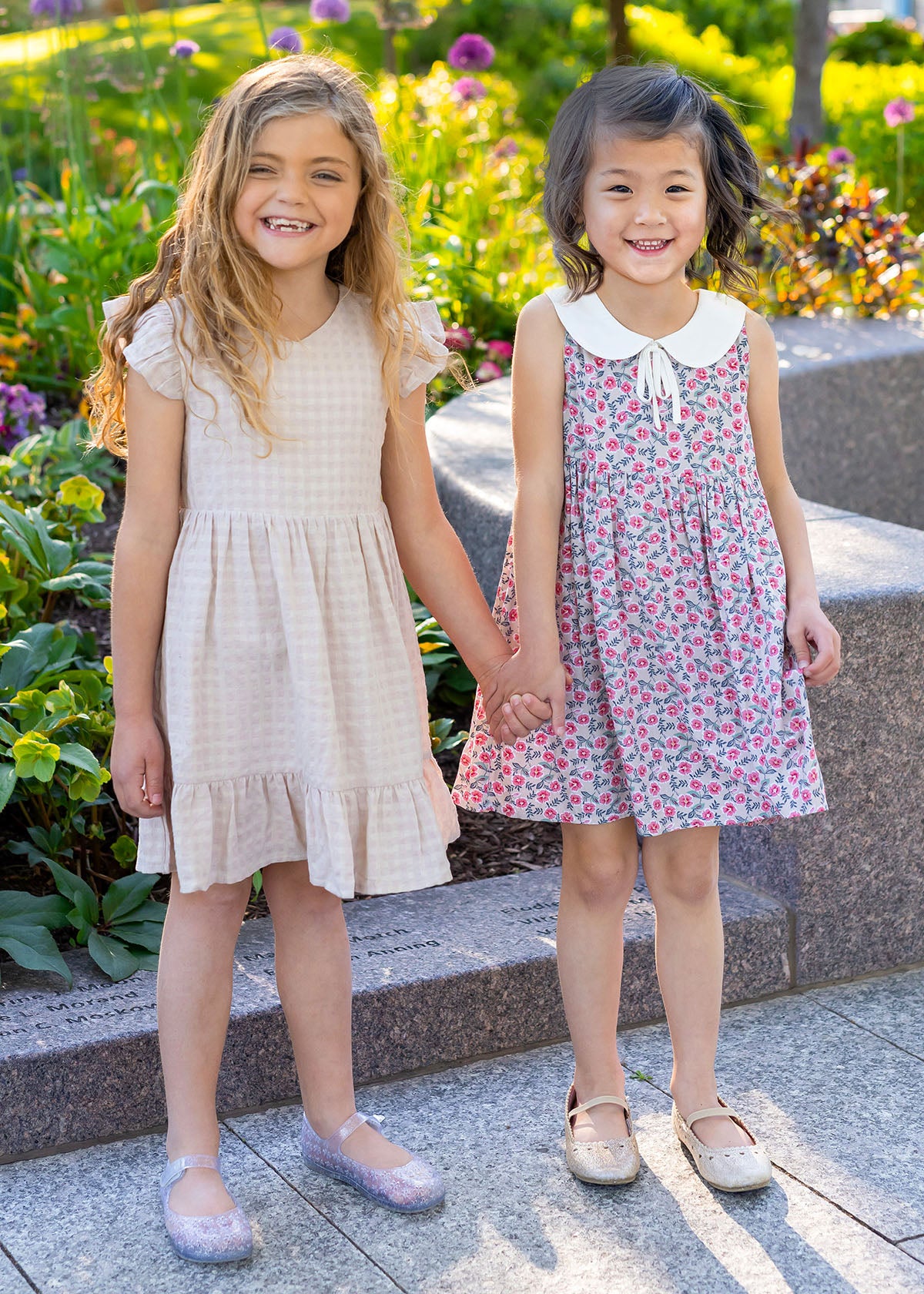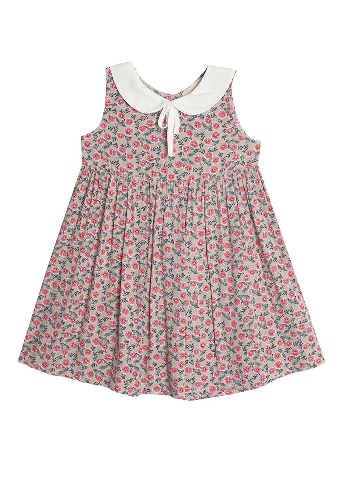 This Mabel and Honey dress captivates with its vintage charm, featuring a delicate floral pattern on a grey background. The sleeveless design, accented with a Peter Pan collar and a sweet bow tie, creates a timeless silhouette. The lightweight fabric offers comfort and ease, perfect for a summer day's adventure.