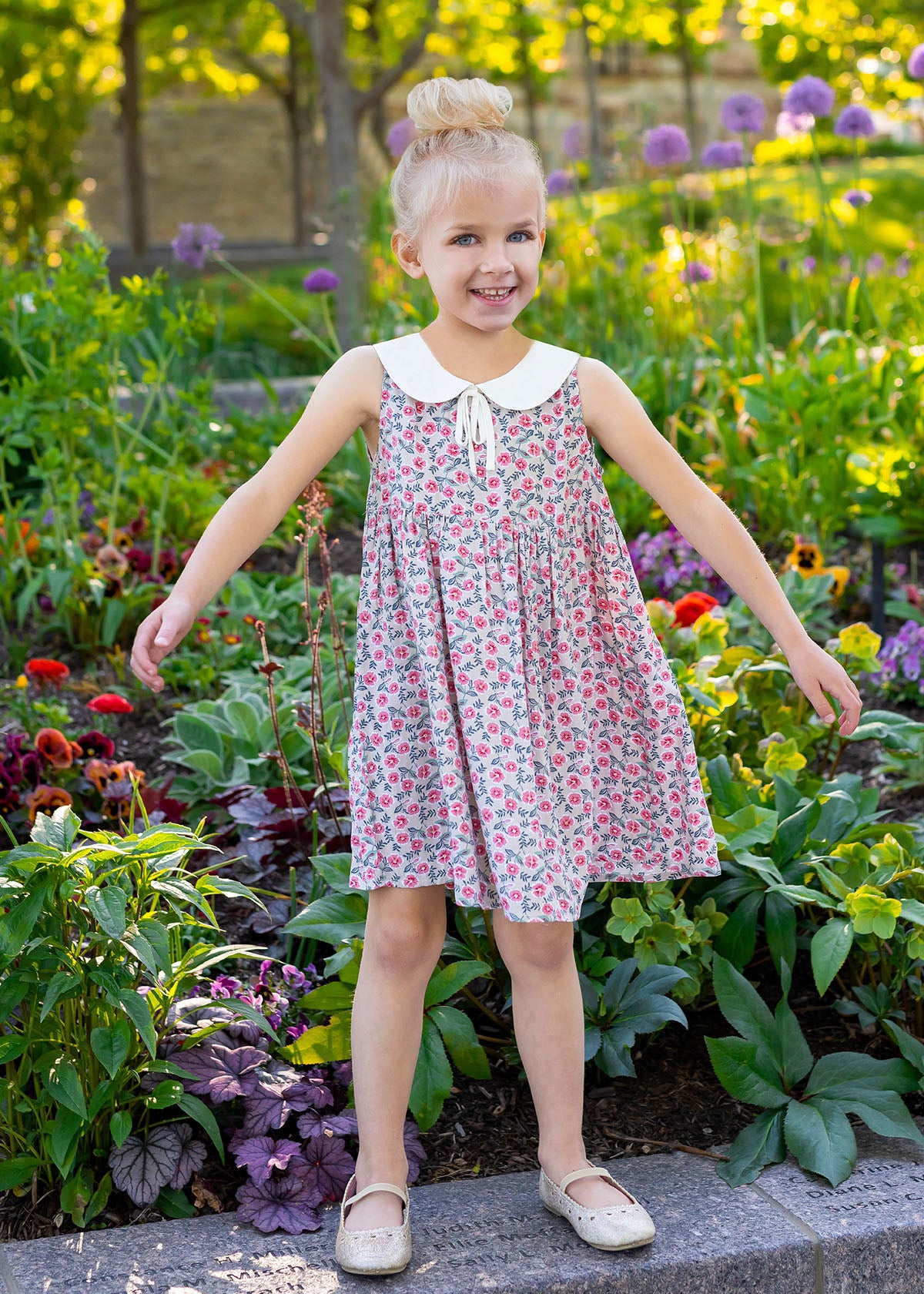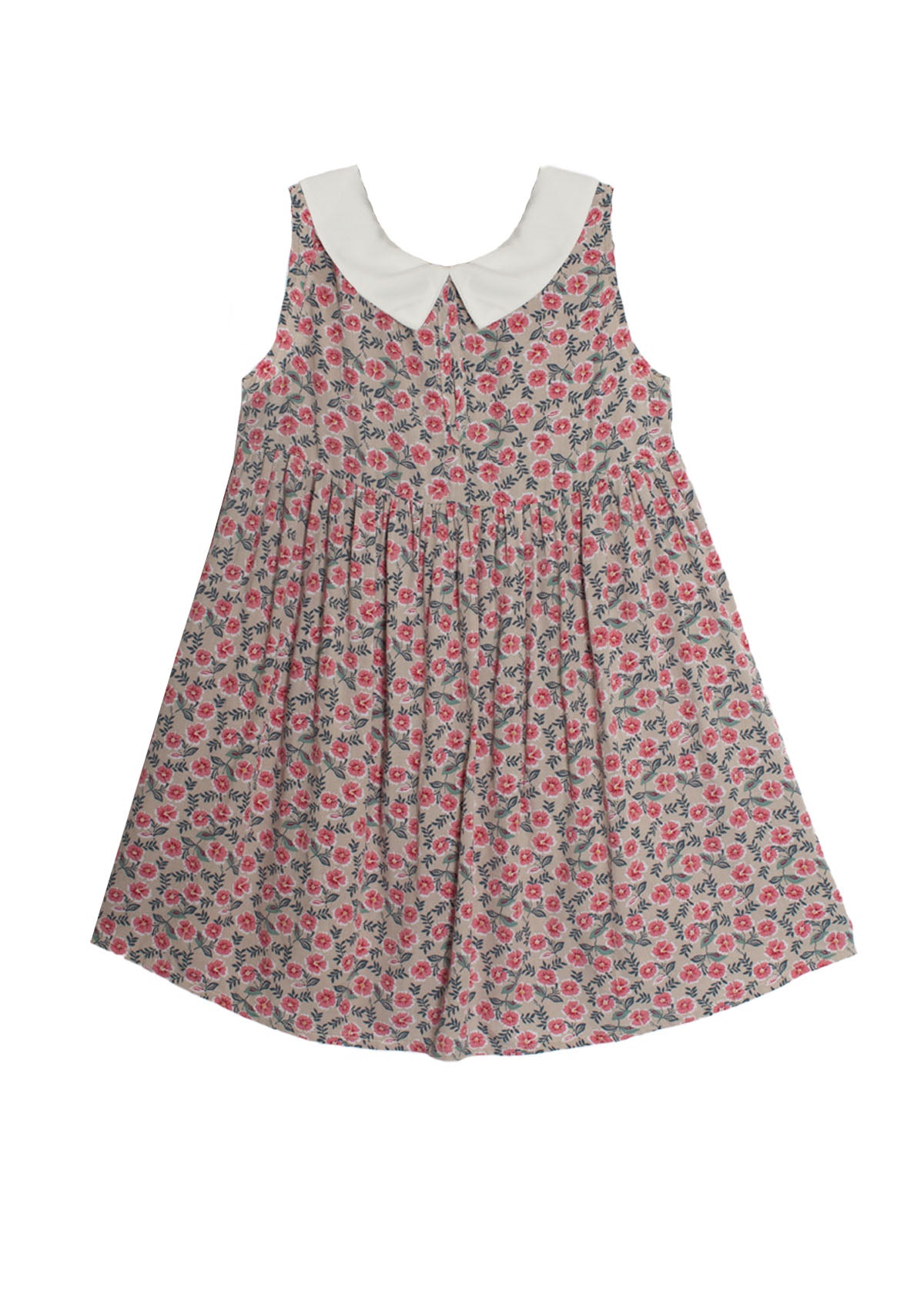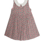 This Mabel and Honey dress captivates with its vintage charm, featuring a delicate floral pattern on a grey background. The sleeveless design, accented with a Peter Pan collar and a sweet bow tie, creates a timeless silhouette. The lightweight fabric offers comfort and ease, perfect for a summer day's adventure.