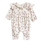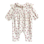 This delightful one-piece features a soft cream backdrop adorned with a delicate sprinkle of pink and green florals, perfect for any day that calls for something extra special. The ruffled neckline and shoulders, combined with the softly gathered waistline, lend a sweet touch to this cozy, all-in-one design.