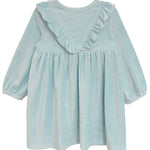 The Blair Dress is a delightful addition to your little one?s wardrobe. Crafted from soft, corduroy-textured fabric in a serene light blue, this dress combines comfort with timeless elegance. The ruffled V-shaped collar adds a touch of flair, while gathered cuffs and a flowing silhouette enhance its playful style. Perfectly balanced between classic design and modern comfort, it?s the ultimate choice for your stylish baby girl.