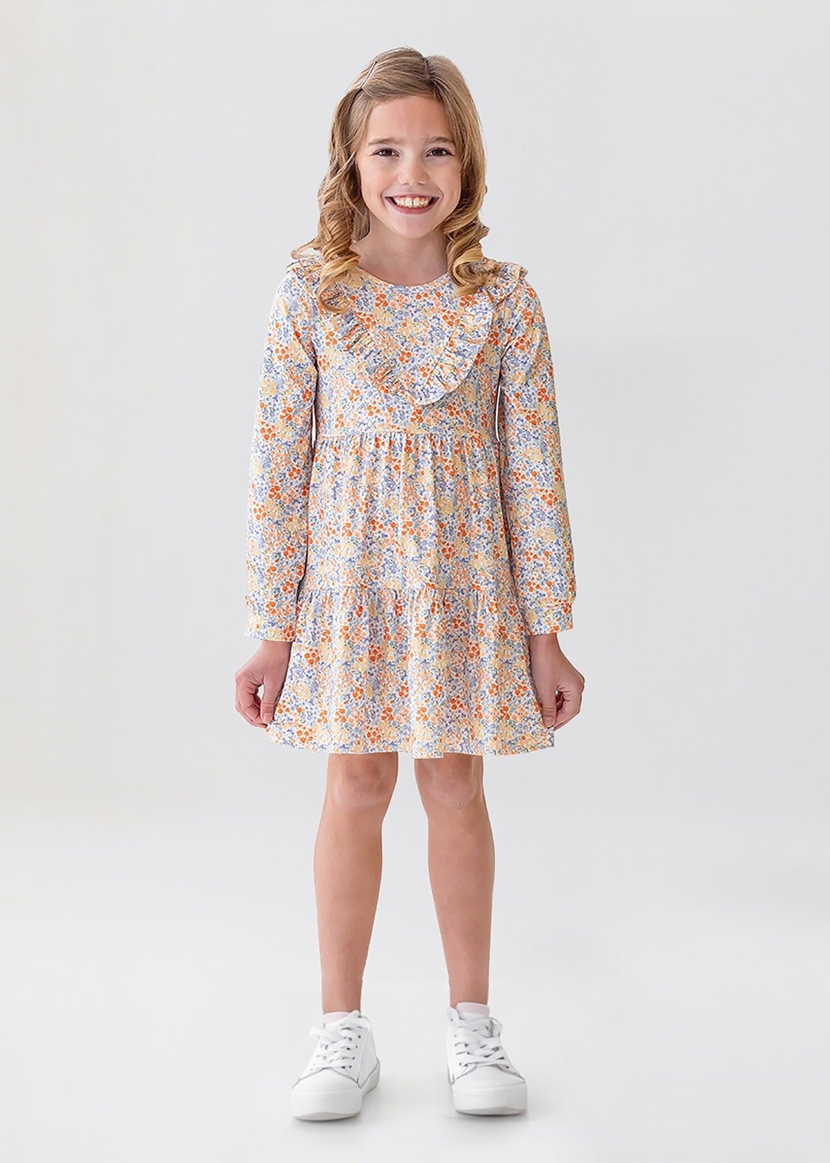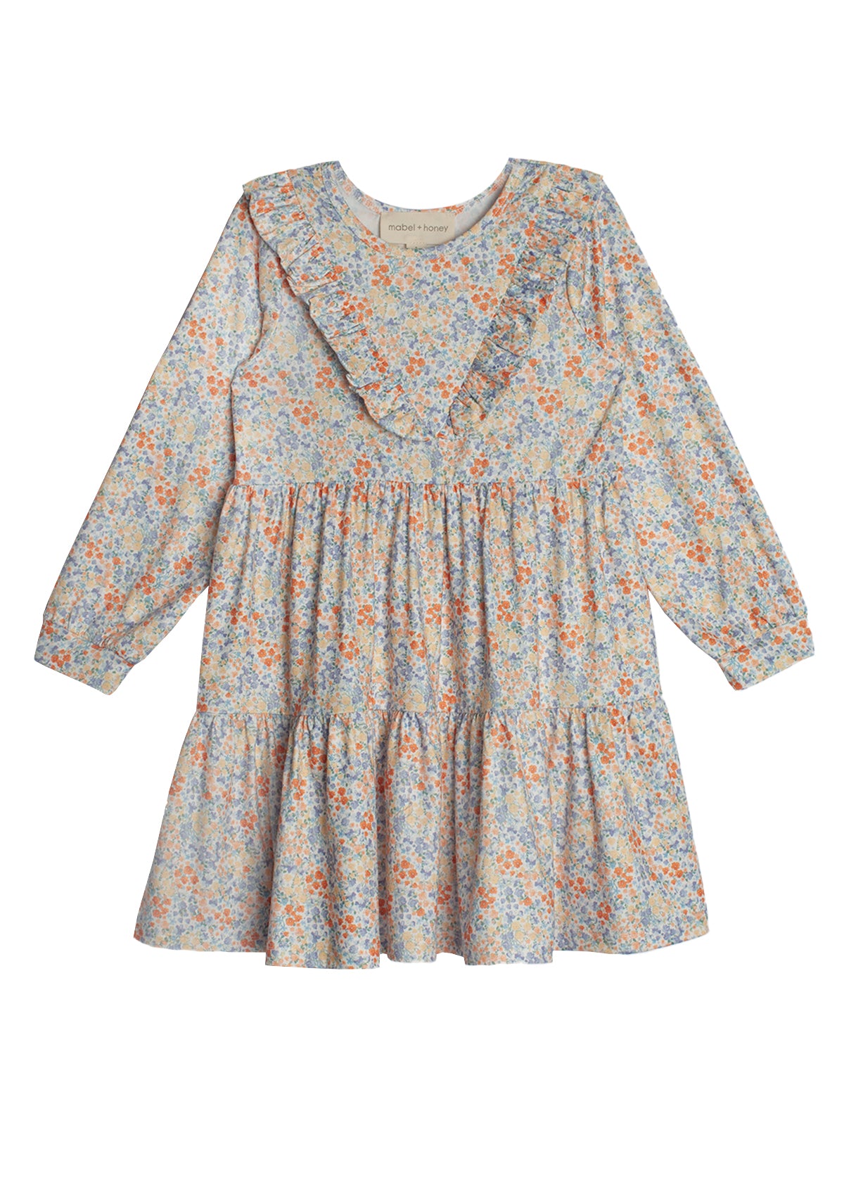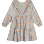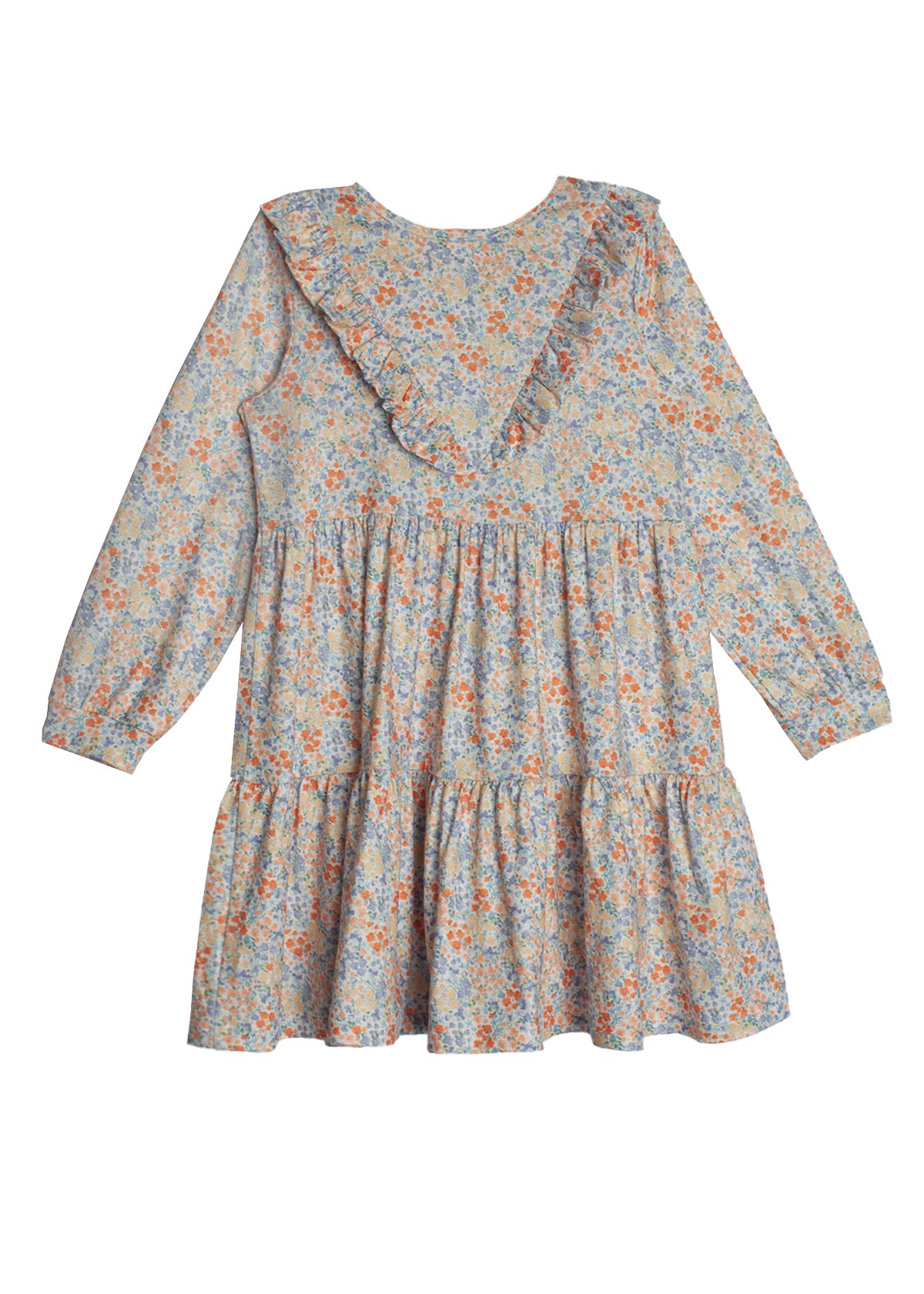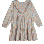 Introduce a burst of spring to her wardrobe with the Darling Orchard Dress. This lovely piece features a delicate floral print in shades of blue and orange on lightweight soft fabric. The dress is accented with a ruffled collar and a full, tiered skirt, perfect for twirling and play. Ideal for both special occasions and everyday wear.