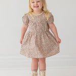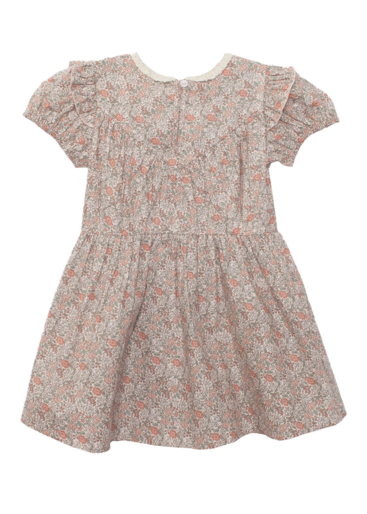 The Emmaline Dress is a picture of timeless charm, designed with thoughtful details to delight. Its soft, breathable fabric features a delicate all-over pink floral pattern, adding a touch of vintage-inspired elegance. With playful ruffled short sleeves, a rounded neckline trimmed with lace, and a gently gathered bodice that flows into a flared skirt, this dress combines comfort and style for a look that?s both effortless and unforgettable.