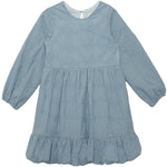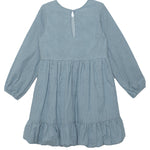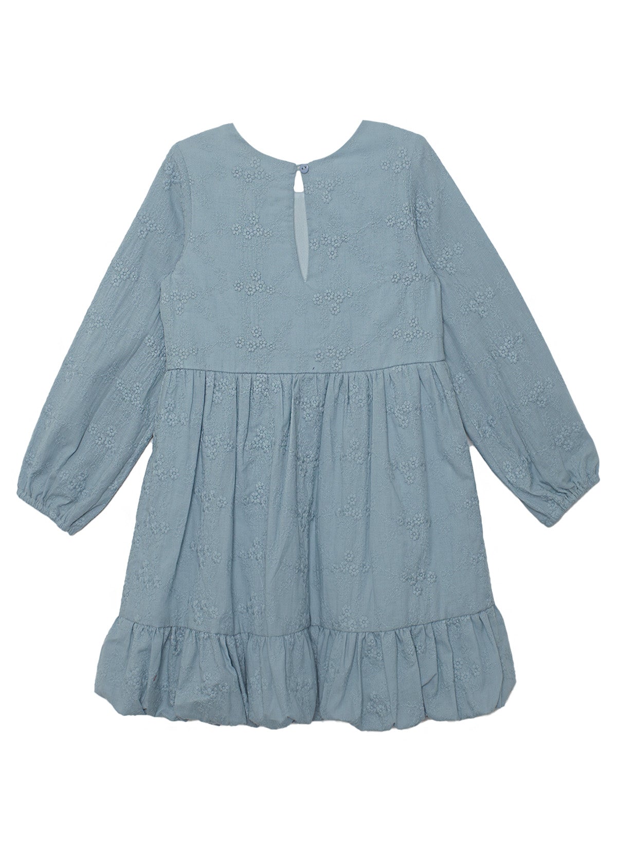 The Eva Dress combines timeless design with thoughtful details for young style enthusiasts. This light blue dress showcases embroidered floral patterns that add texture. Featuring long sleeves, a round neckline, and a gathered waistline leading to a flared skirt with a ruffled hem, it offers both comfort and elegance. A subtle back opening provides a practical yet refined finishing touch?perfect for everyday play or special outings.