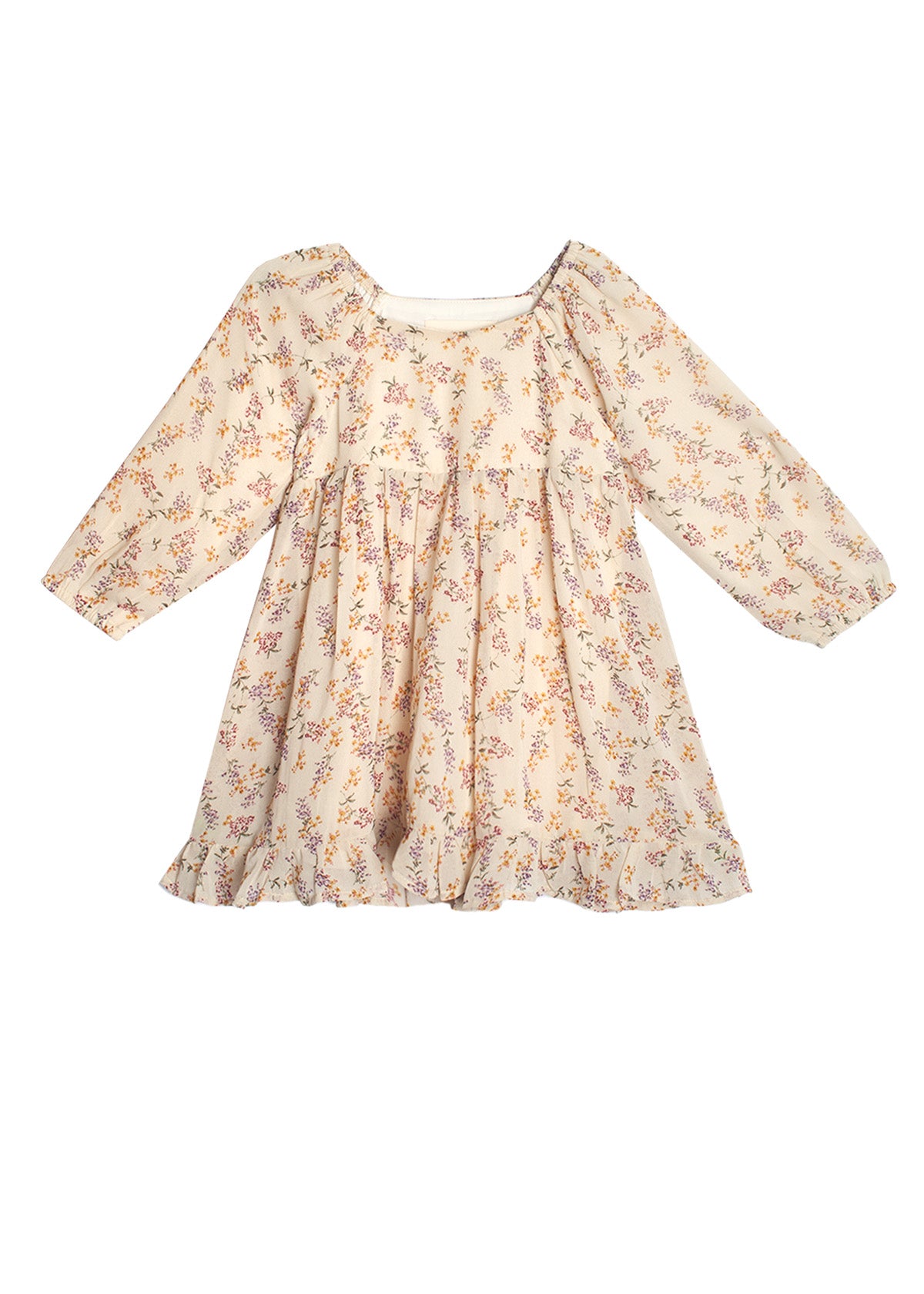 Dress your little one in timeless elegance with this lovely long-sleeve dress, perfect for any occasion. Made from soft, breathable cotton, this dress features a charming cream base beautifully accented with a delicate floral print in shades of pink, lavender, and gold. The flowy silhouette is enhanced with subtle gathering at the waist, offering a comfortable fit with a touch of flair.