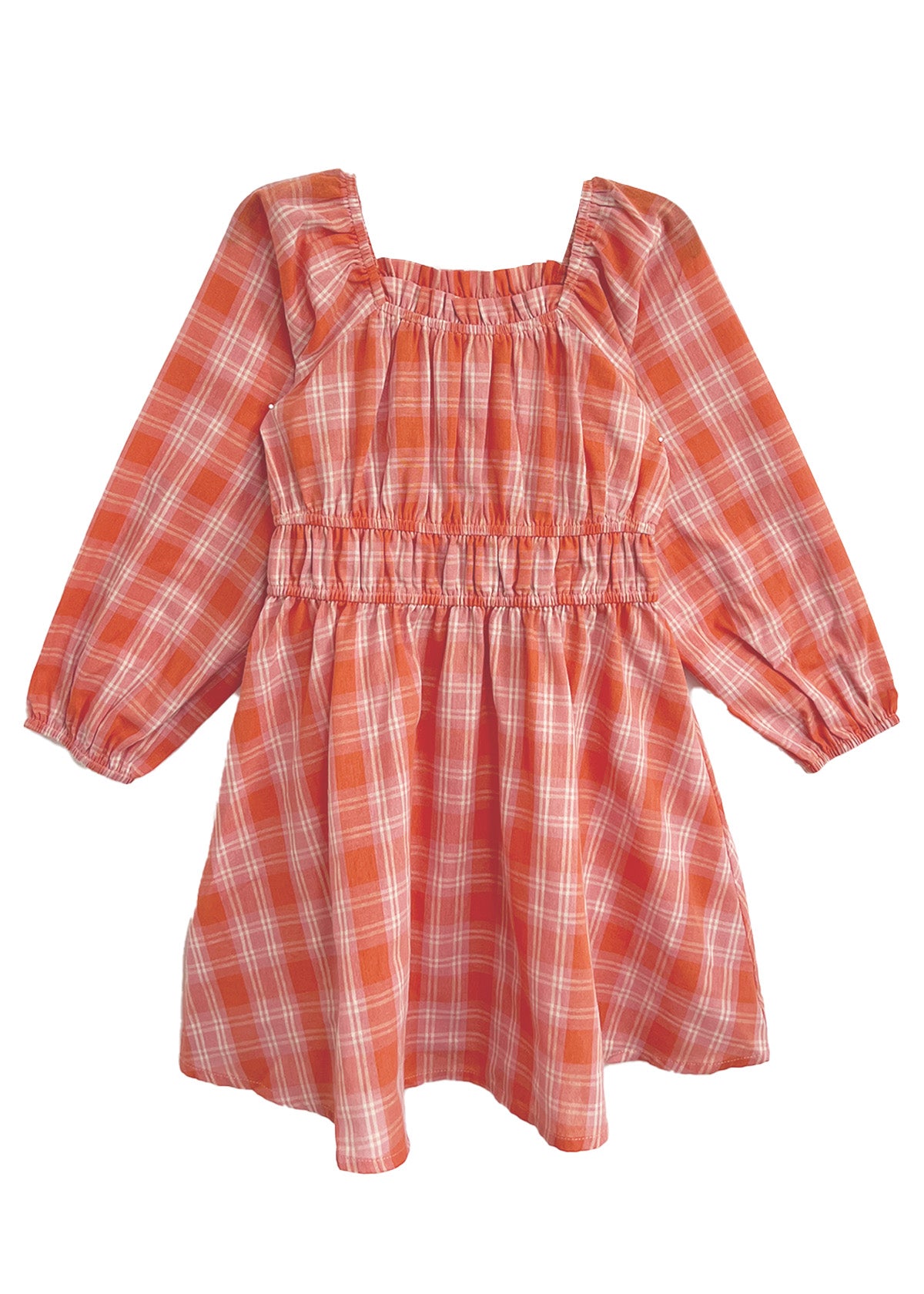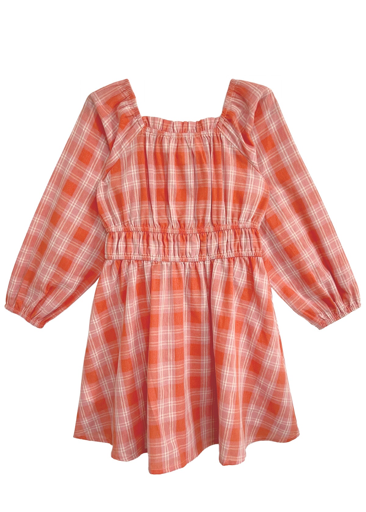 The Amelia Dress is a delightful blend of easygoing style and thoughtful design. Featuring a vibrant orange and white plaid pattern, this long-sleeve dress is perfect for creating a fresh, timeless look. Elastic accents at the waist and cuffs ensure a comfortable fit, while the ruched neckline and gathered detailing add a touch of playful texture. Ideal for enlivening any girl?s wardrobe!