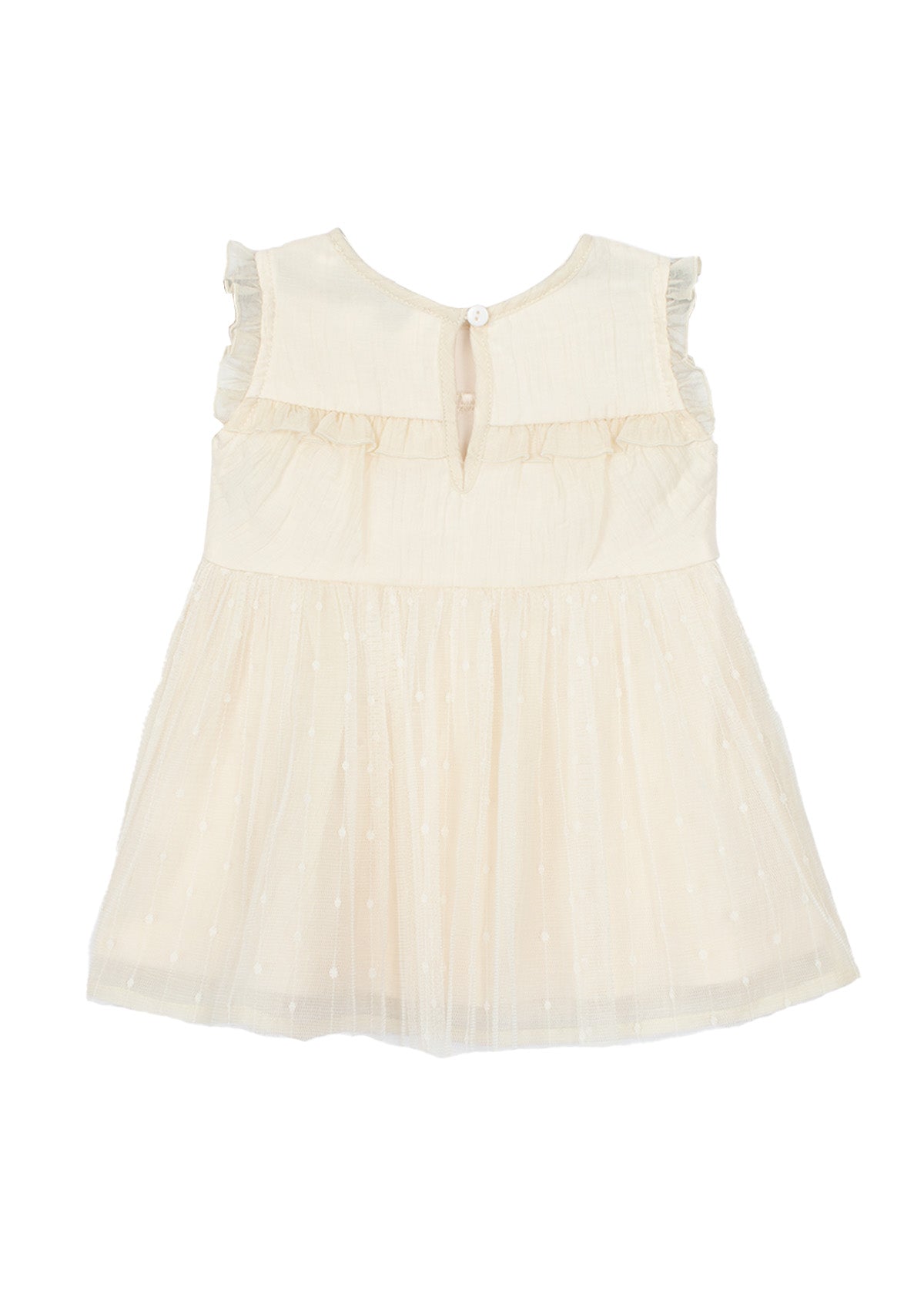 This girls' dress in soft ivory features a lightweight fabric with delicate dotted tulle overlay on the skirt for an airy, elegant look. Ruffle details along the shoulders and bodice add a sweet touch, while the gathered waist creates a flowy silhouette. A back button closure ensures easy dressing.