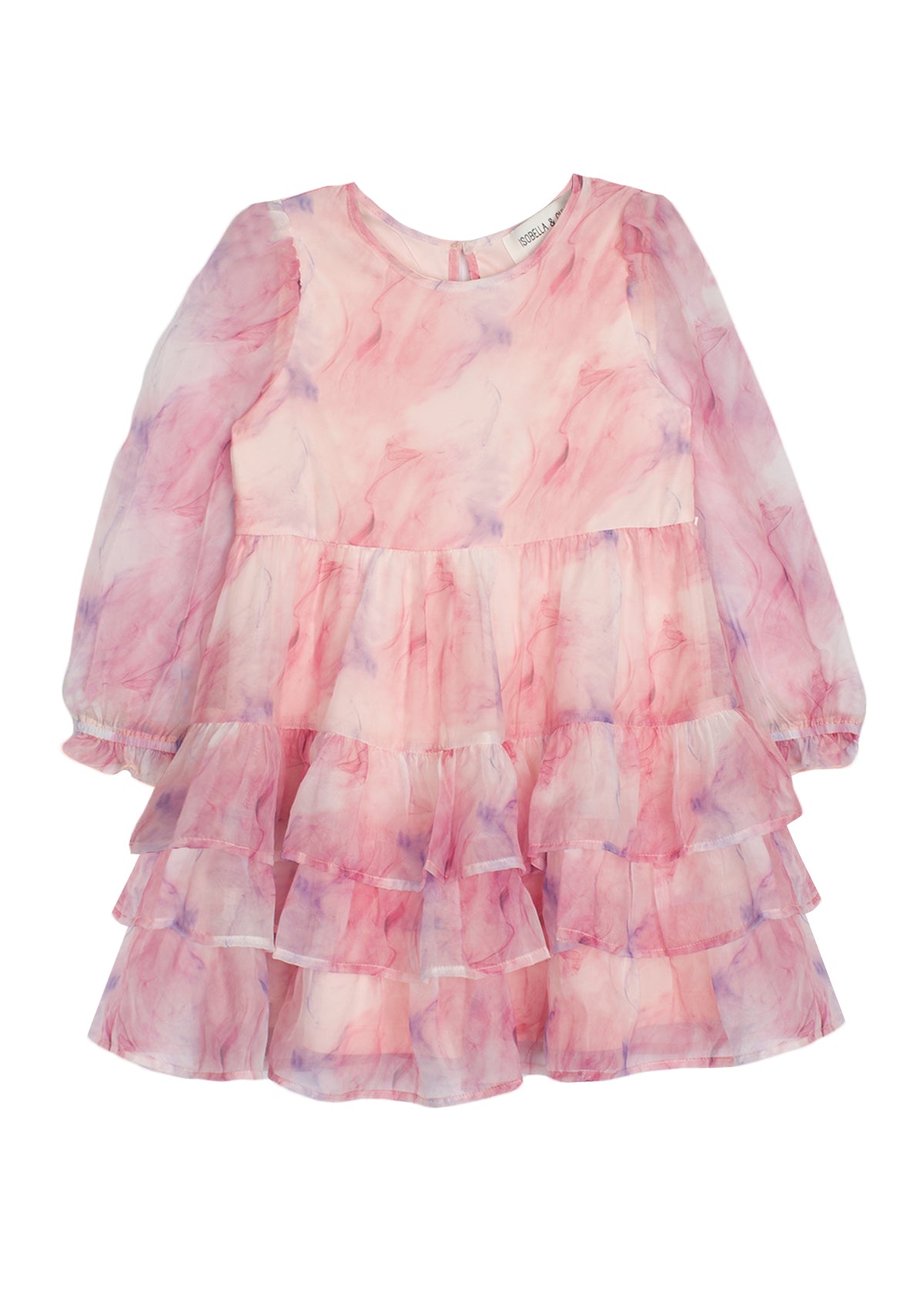 Step into a dream with the Berry Swirl Dress, featuring a whimsical blend of pink and purple hues in a watercolor print. Made from light, airy chiffon, this dress boasts a cascade of ruffled tiers that dance with every twirl. Long sleeves make it perfect for any season's festivities.