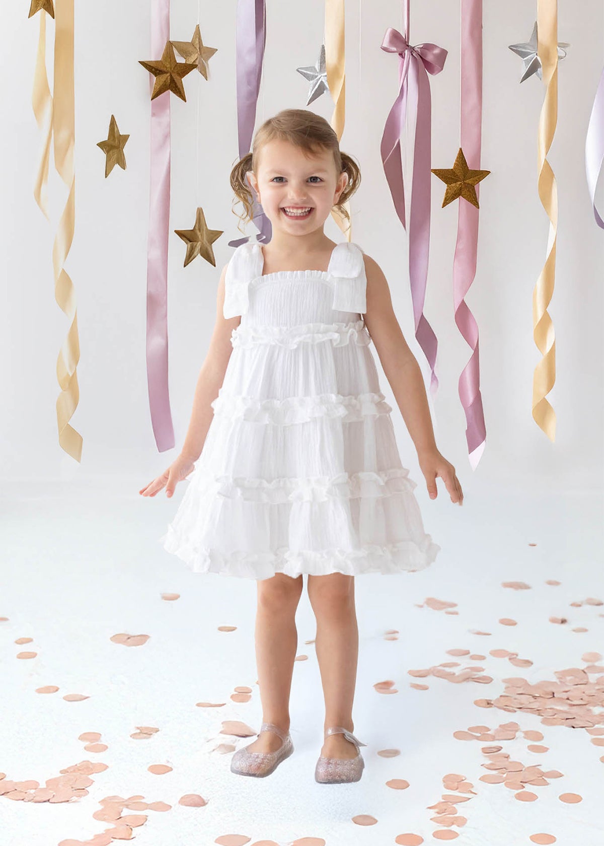 This gauze fabric tiered dress features a bow detailed shoulder straps for a stylish touch. The full, tiered ruffled skirt is made for twirling, creating wonderful moments and memories you will both treasure. It's an elegant choice for any special occasion.
