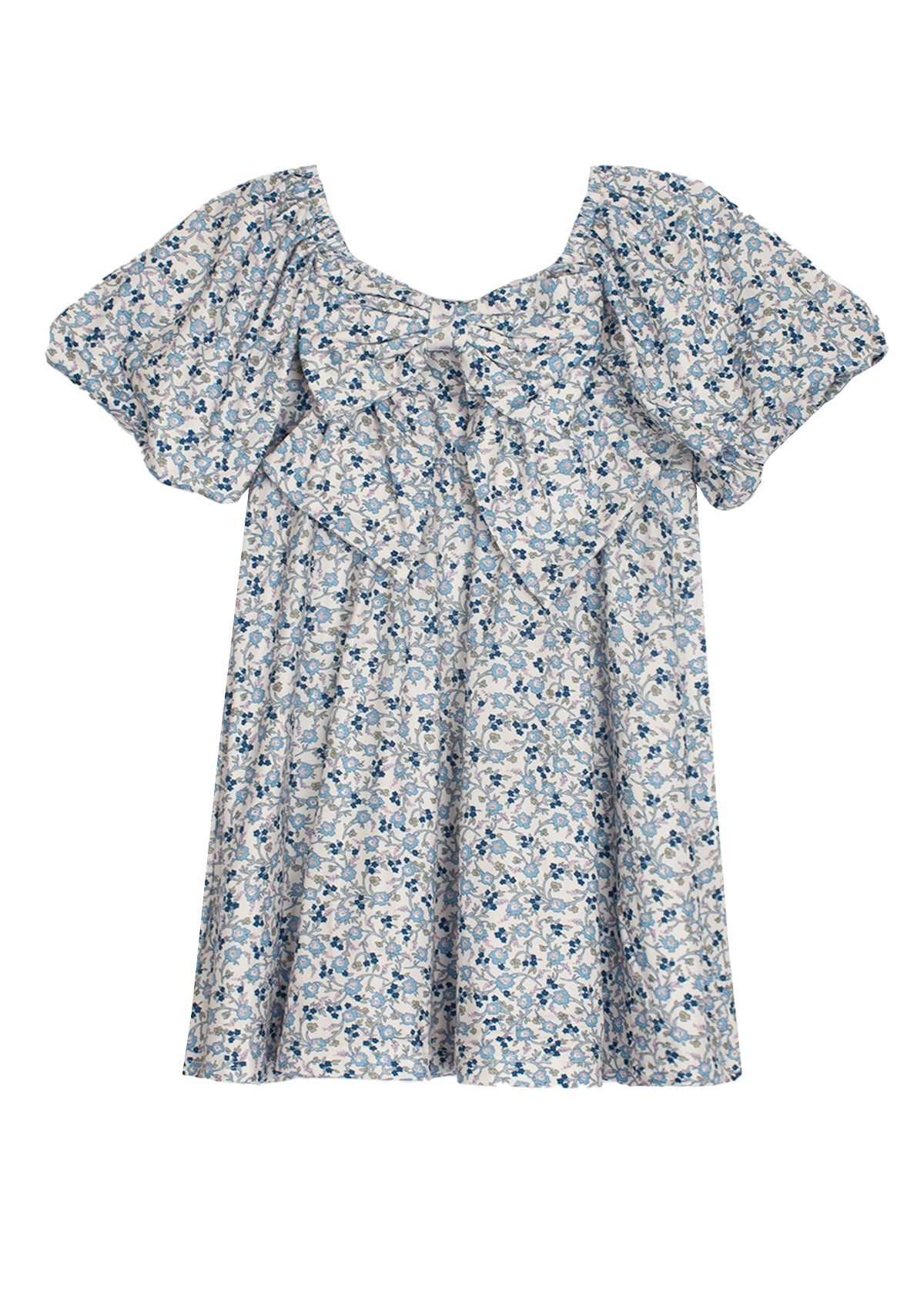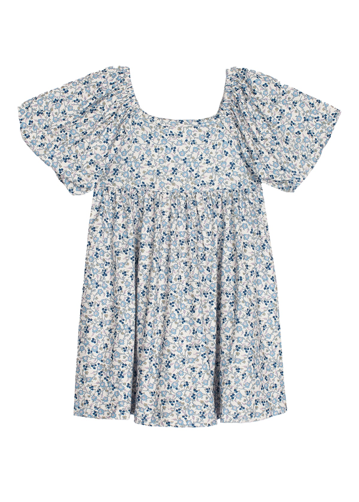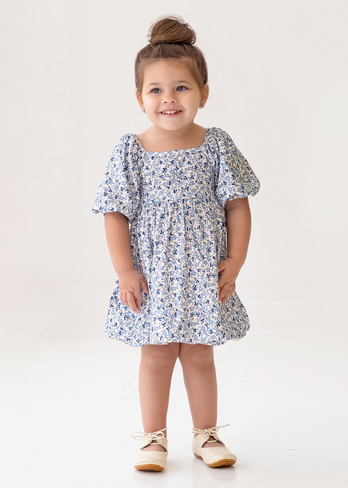 This girl's dress showcases a charming blue and cream floral pattern, perfect for a touch of timeless elegance. The square neckline and puffed short sleeves add a playful yet sophisticated detail. With a gathered empire waist and a flowy, knee-length skirt, this dress is ideal for twirling through any occasion.