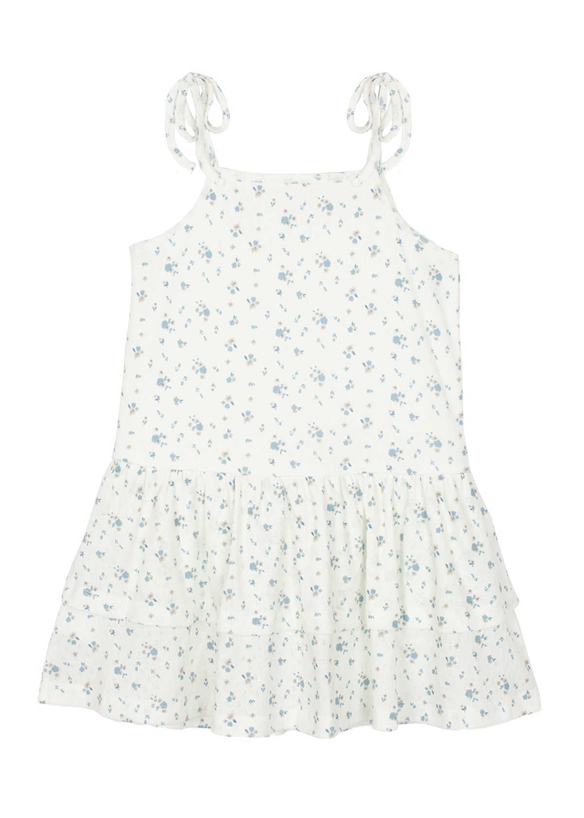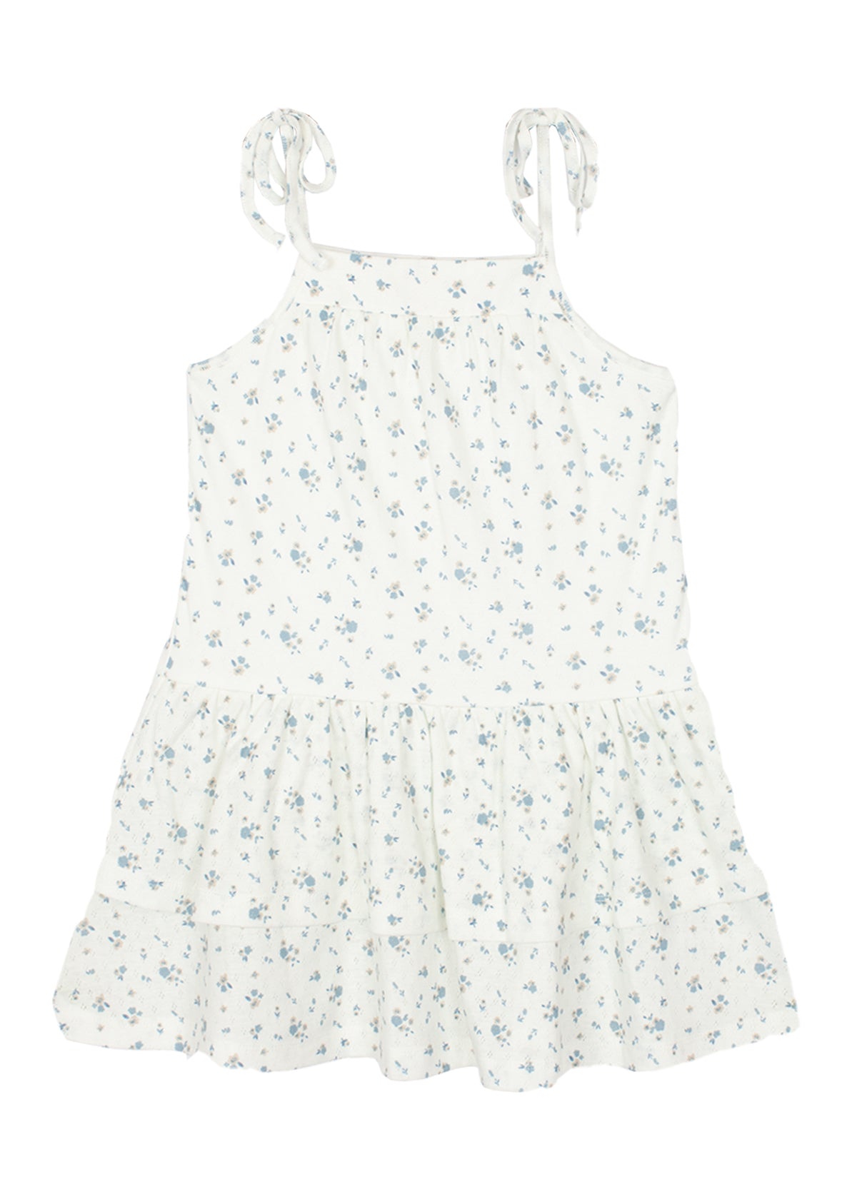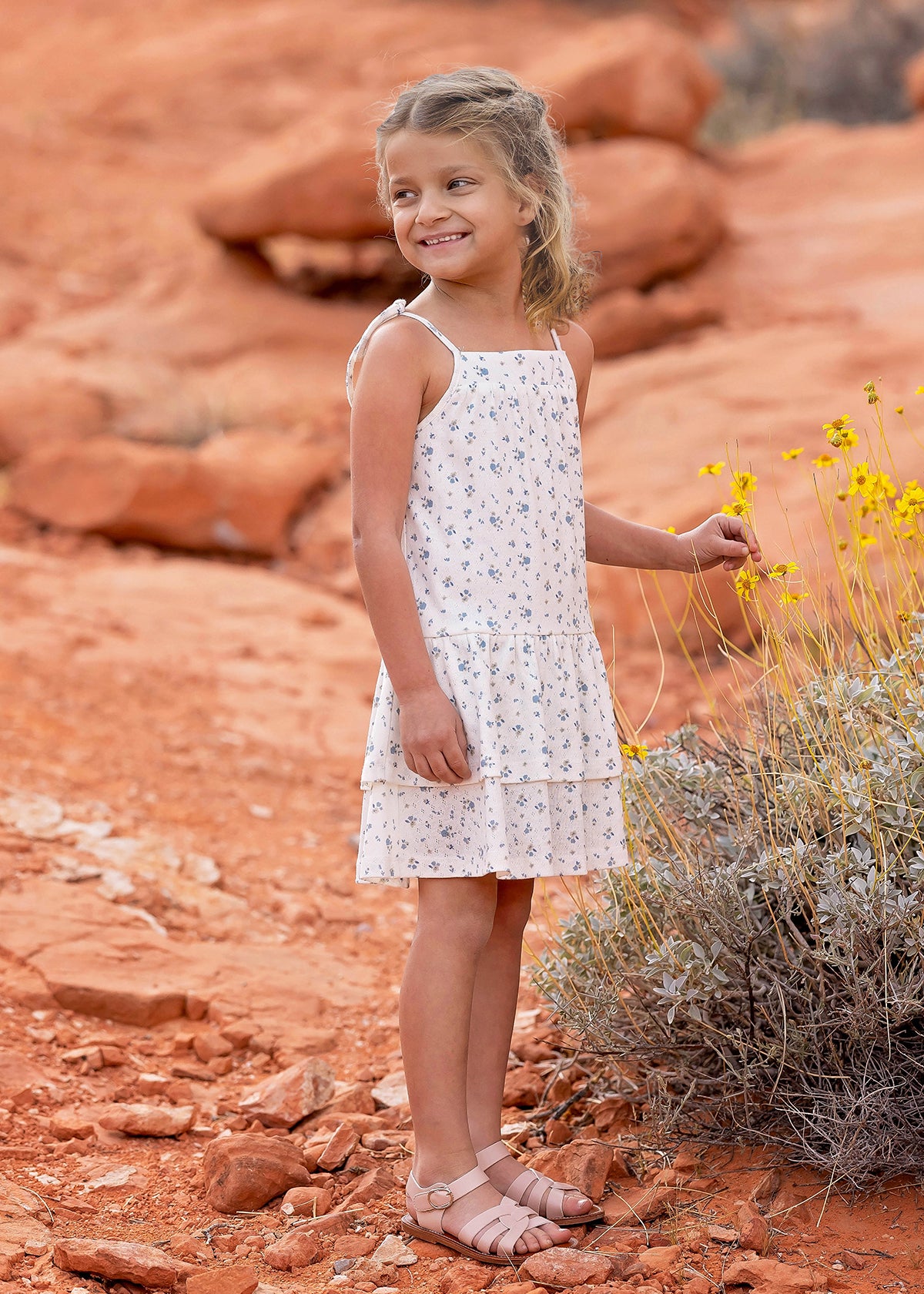 This girls' dress features a soft ivory base with a delicate blue ditsy print for a timeless look. Designed with adjustable tie straps and a flowy tiered skirt, it offers a breezy, relaxed fit. The lightweight fabric ensures comfort, making it perfect for warm-weather outings and special occasions.
