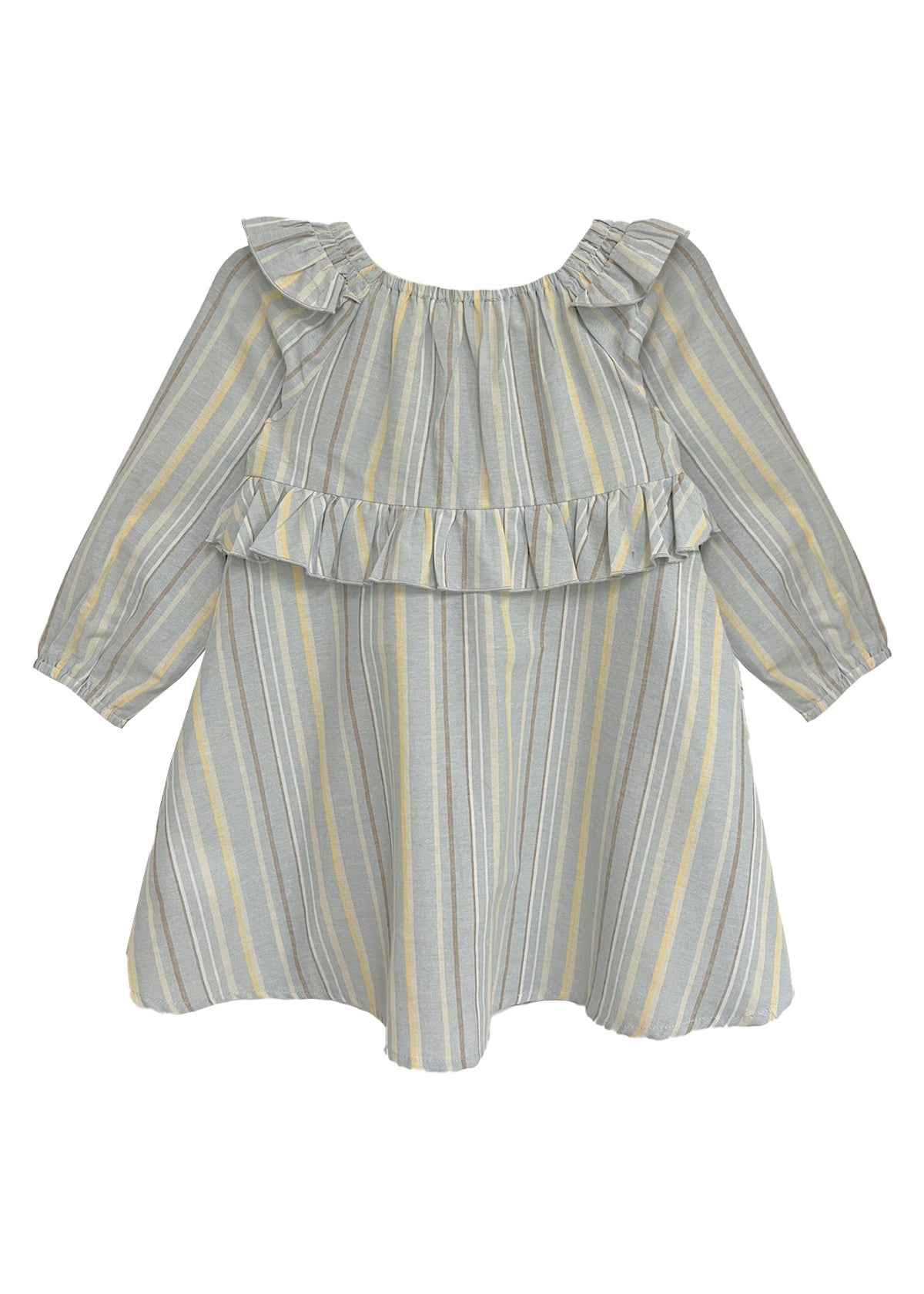 Soft pastel hues and an enchanting stripe pattern make the Brooklyn Dress a delightful wardrobe staple. Designed with an elastic neckline and puffed sleeves, this dress offers comfort with plenty of style. Thoughtful ruffle details along the neckline and chest add a playful touch, while its flowing silhouette is ideal for twirls and movement, making it perfect for your little one?s adventures.