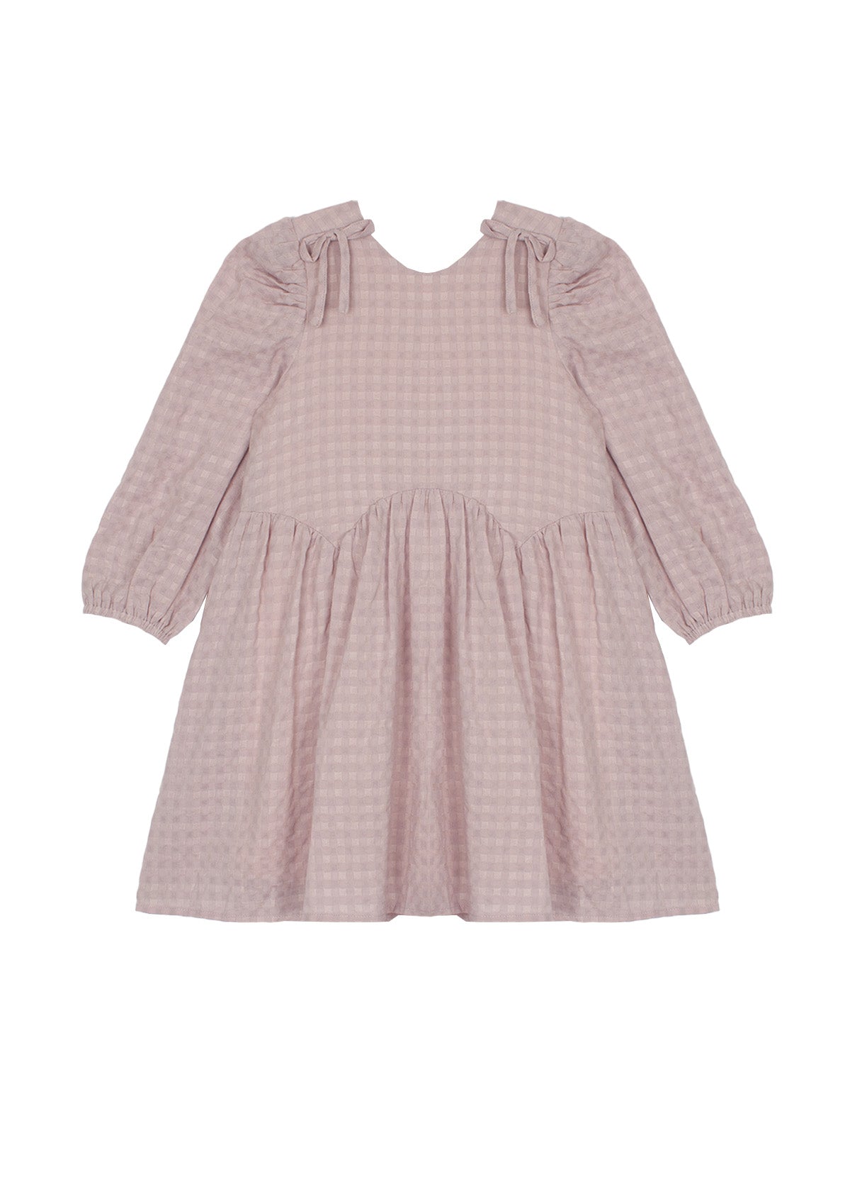 The "Check Me Out" girl's dress is crafted from a soft, breathable fabric in a delicate mauve gingham pattern. This dress features long sleeves with elasticized cuffs and charming bow details at the shoulders, adding a touch of elegance. The gathered waist enhances the silhouette, making it an ideal choice for both casual and special occasions.