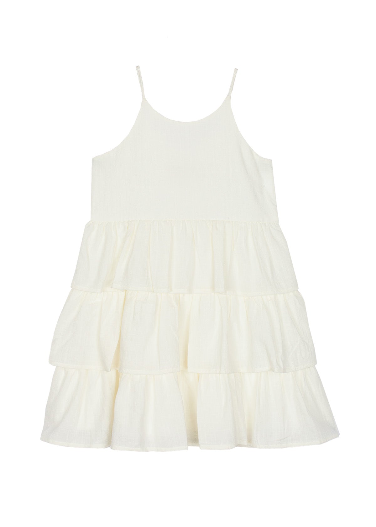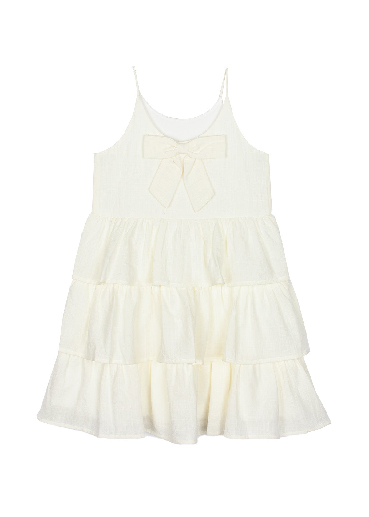 This ivory girls' dress features a breezy tiered silhouette with delicate spaghetti straps for an effortlessly elegant look. Crafted from a lightweight, textured fabric, it offers breathability and comfort for warm days. The flowy design adds graceful movement, making it a perfect choice for special occasions or everyday wear.